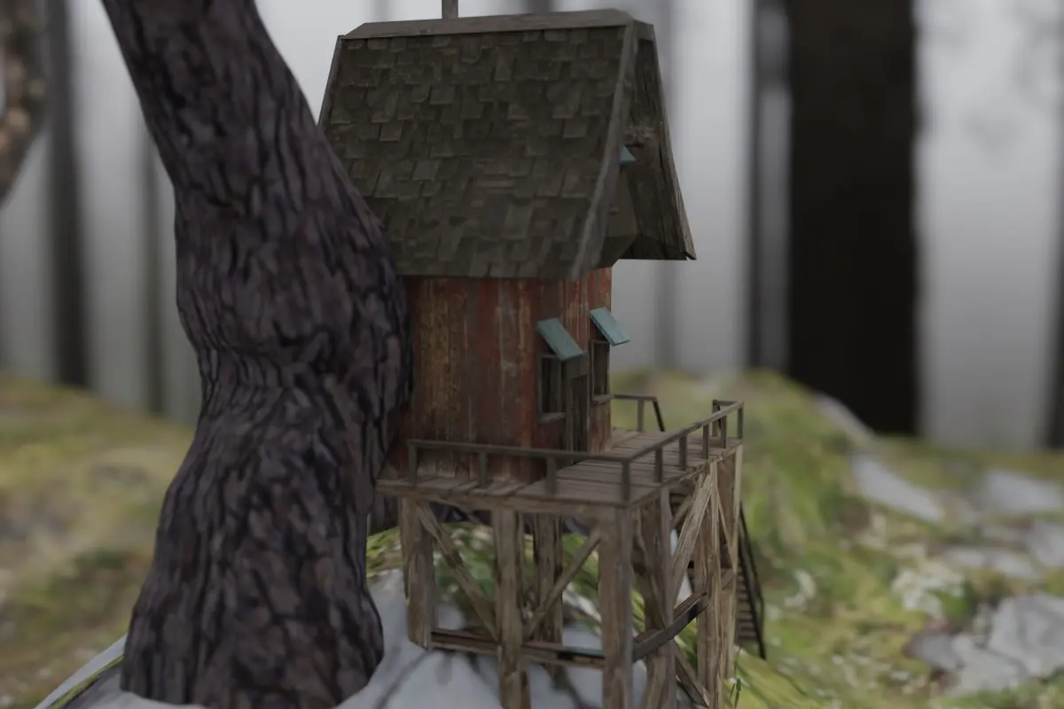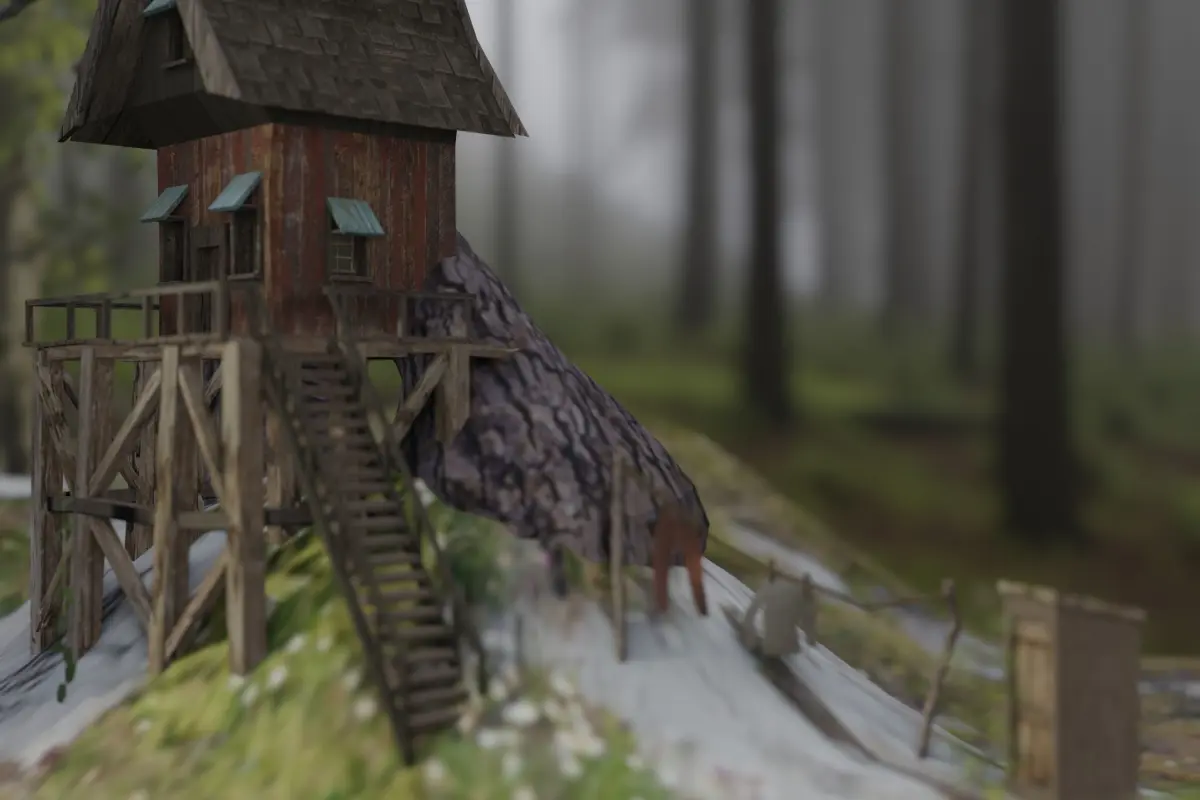 A fantasy scene with a dwarf hut in the forest, complete with a clothesline and an outhouse. The scene includes the terrain, the house, the clothes line and the outhouse as well as the tree. The background and other environment ist not included. Other file formats are x3d.