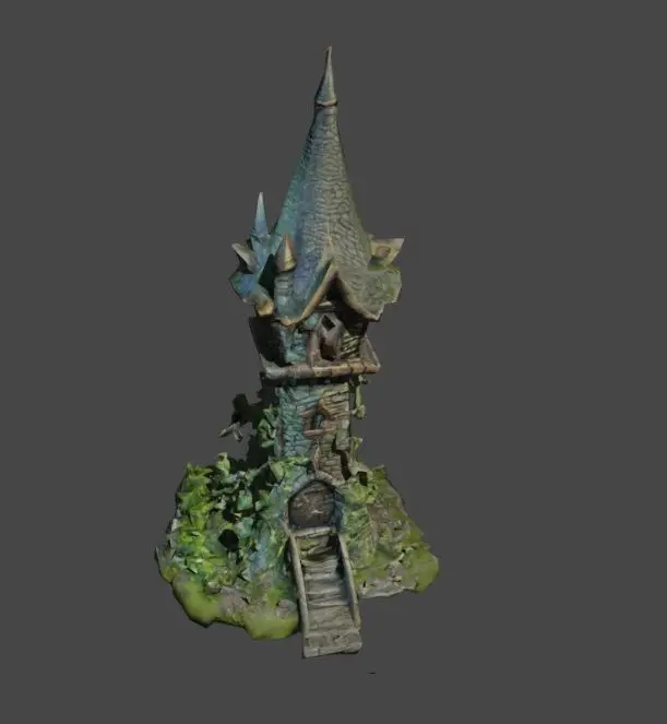 Use this to towers defense. Fantasy tower made of stone with a sharp roof and vegetation around. Low detail, for a top view.