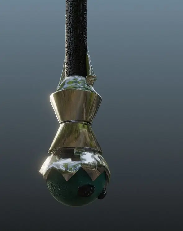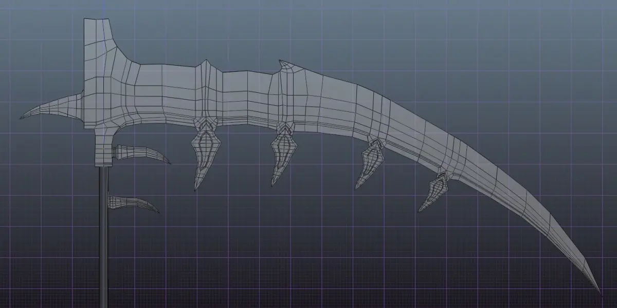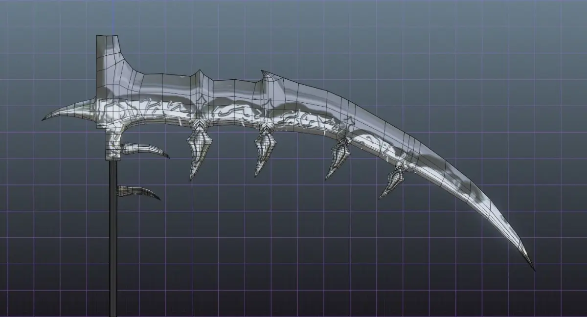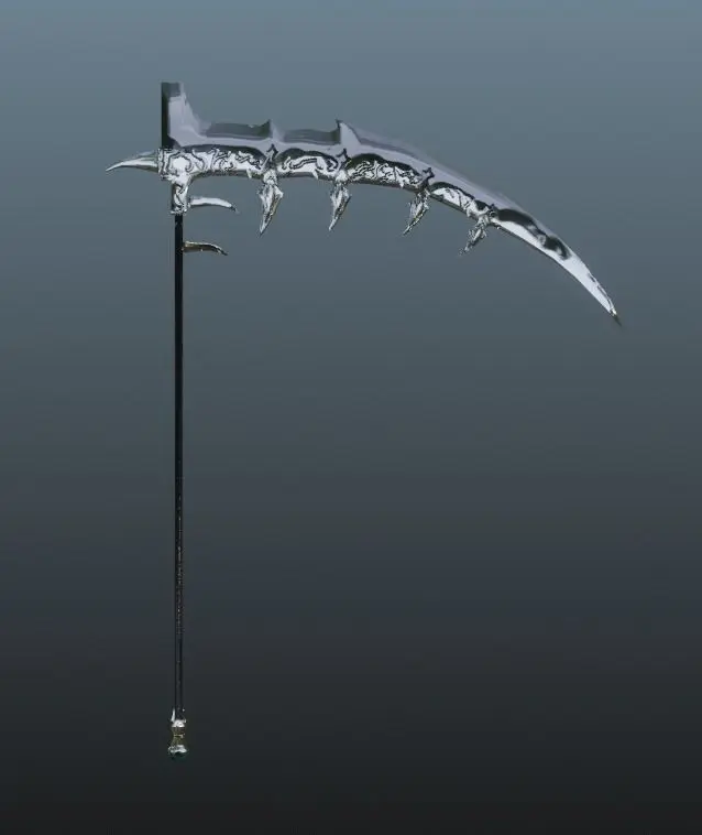 A fantasy scythe melee weapon with jagged/spiked blade and light carvings in the metal. Made with Blender and Substance Painter.