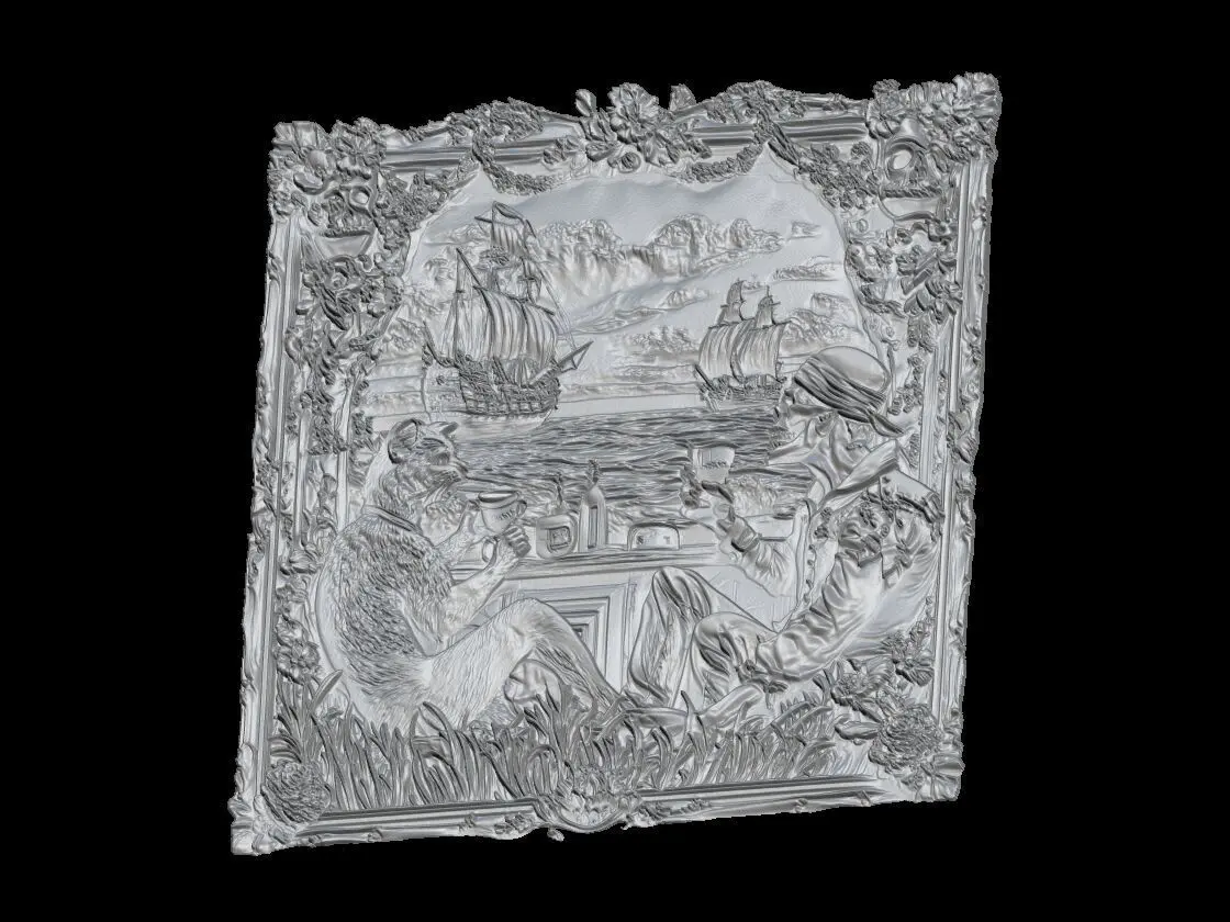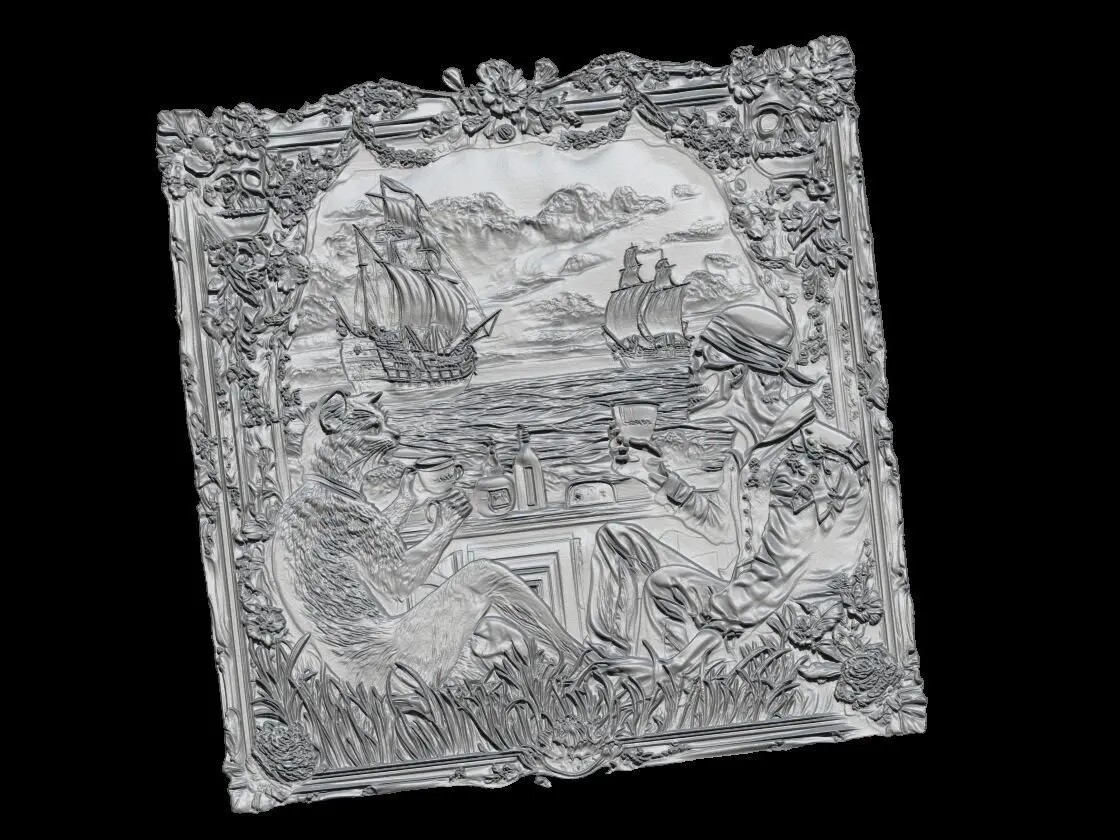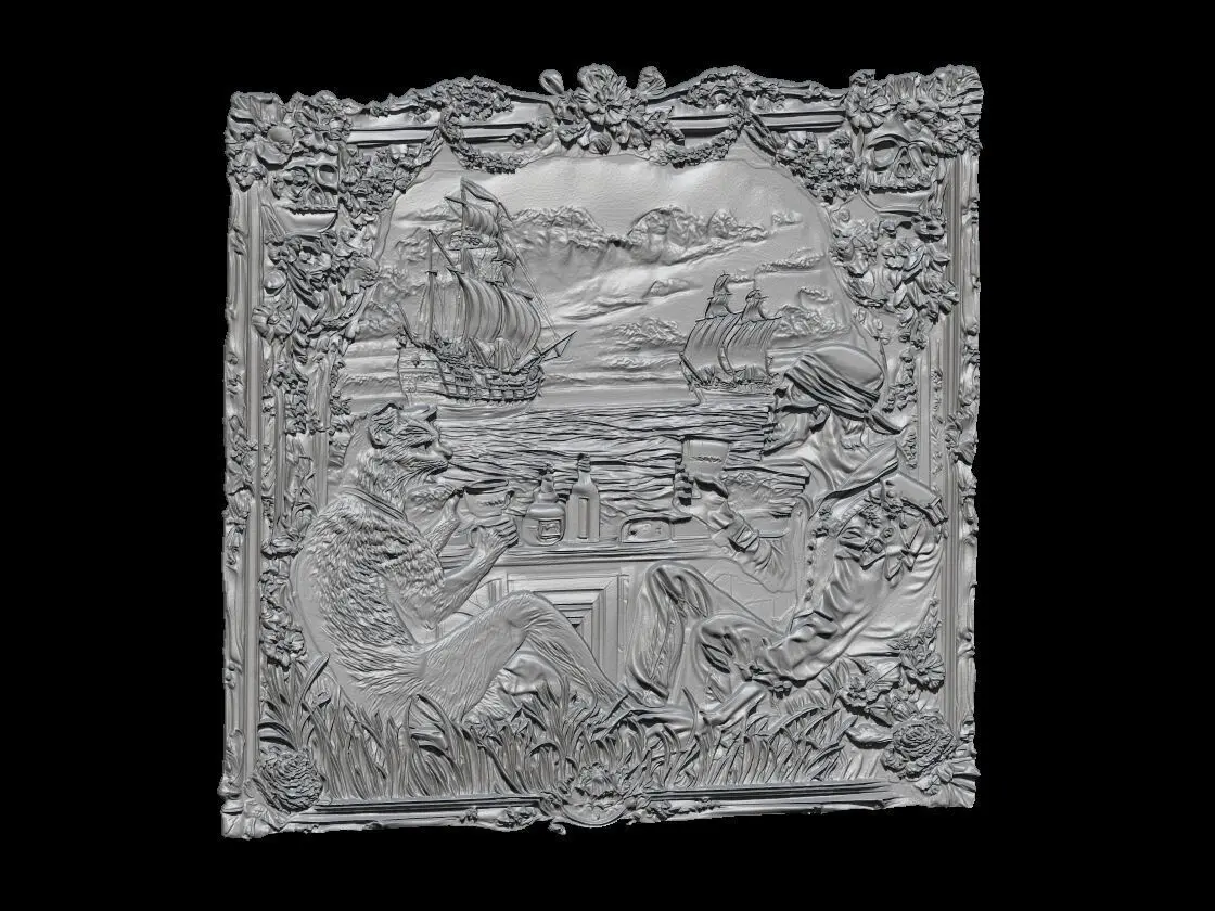 High-detailed 3D grayscale relief artwork featuring a fantasy scene of a cat and a skeleton pirate drinking coffee at a bar, with vintage ships sailing in the background. Surrounded by an ornate floral frame with skulls, grass, bottles, and symbolic elements. Perfect for CNC carving, laser cutting, resin art, or 3D printing wall décor. Ideal for fantasy lovers, gothic home decoration, or collectors of unique artistic pieces. Ready-to-print STL file optimized for relief carving and decorative panels.
