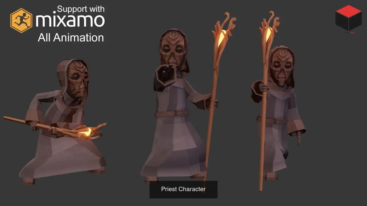 Priest Fantasy Character and Staff/ Low Poly Model/Game Ready /Rig/ All Animation MIXAMO