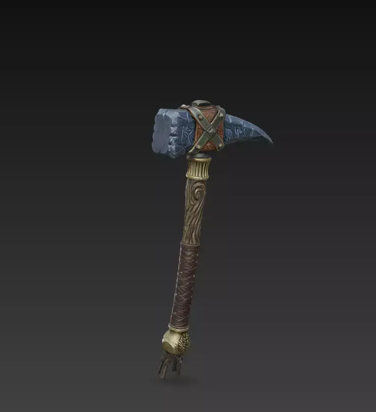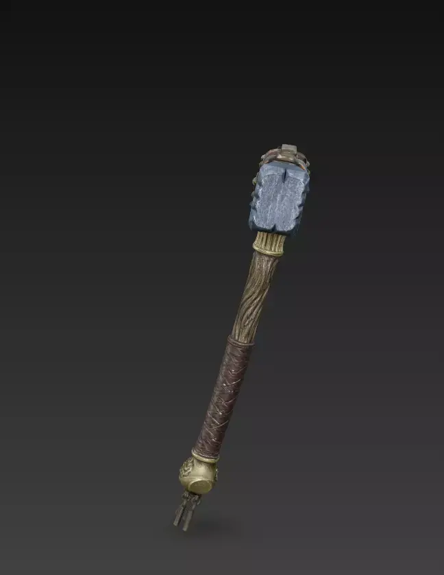 Crafted from a real-world physical prop and digitized into a high-fidelity 3D asset, this warhammer balances a stylized fantasy aesthetic with the grounded realism of true photogrammetry textures. The model features a heavy, battle-worn stone head etched with glowing blue runes, secured by sturdy metal bindings. The haft showcases intricate, stylized wood grain, leading down to a tightly woven leather grip and an ornate brass-toned pommel with dangling accents.