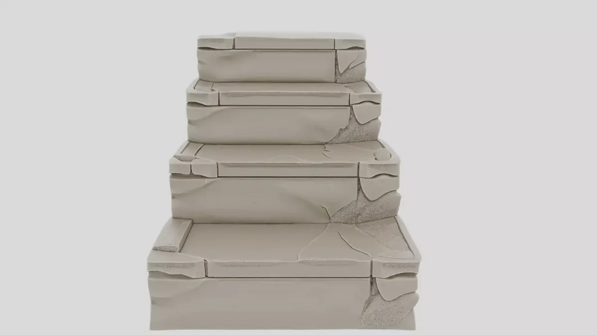 This fantasy stone dungeon stair block is designed as a modular terrain element for underground corridors, ruins, and fortress interiors in tabletop gaming environments. The model represents a short section of worn stone steps carved directly into a solid block. Chips, cracks, and erosion are sculpted into the geometry to suggest age and heavy use. The model is fully static and delivered without texture, making it completely ready for 3D print and ideal for painting. The solid construction ensures durability and stable placement during gameplay. This stair block can be used alone or combined with other terrain pieces to create elevation changes, choke points, or dramatic entrances without requiring precise measurements or assembly.