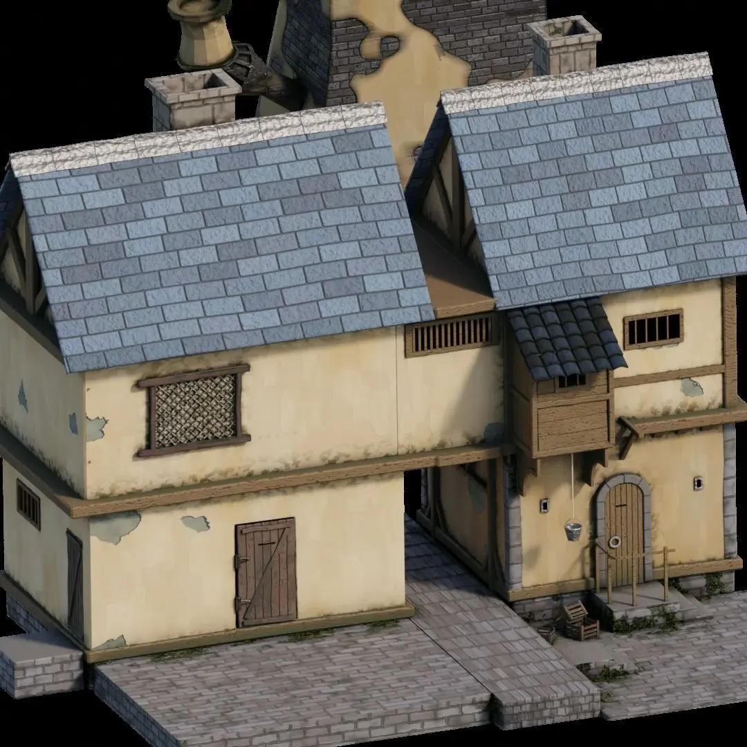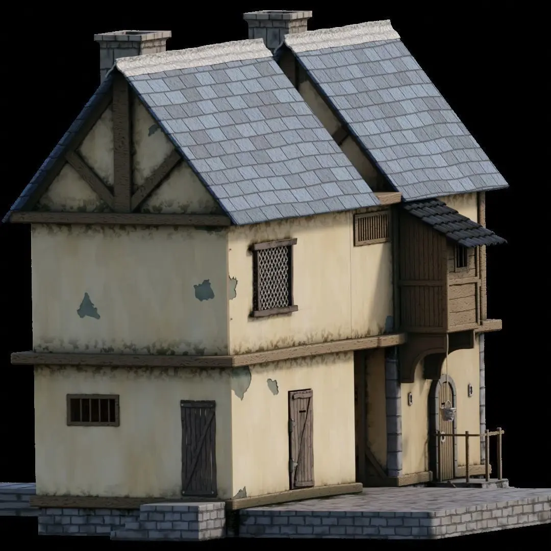 Model of fantasy medieval house. Game ready 3d model of a fantasy medieval house on Blender. Textures only work on Blender as they are Only procedural materials, no baked textures..