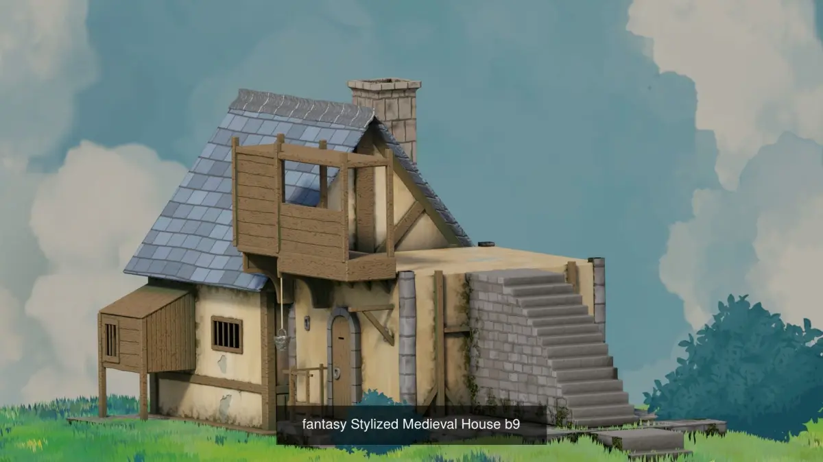 Model of 4 fantasy medieval house. animation ready 3d model of a fantasy medieval house on Blender. Textures only work on Blender as they are node setups.