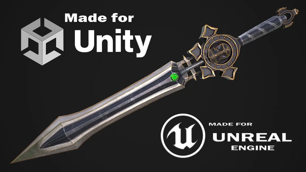 Hello. This is a high definition quality polygon of a Fantasy sword 17 3D Model with PBR textures. Extremely detailed and realistic. Suitable for movie prop, architectural visualizations, advertising renders and other. The archive includes Obj and FBX, Marmoset scene, textures for the Unity: Base color, Height, Metallic, Mixed AO, Normal_OpenGL, Roughness. And also included in the archive textures for UE: BaseColor, Normal, OcclusionRoughnessMetallic. All textures are 4k resolution. The number of materials corresponds to the number of main objects in the scene. The model contains 1 object: Fantasy_sword_17