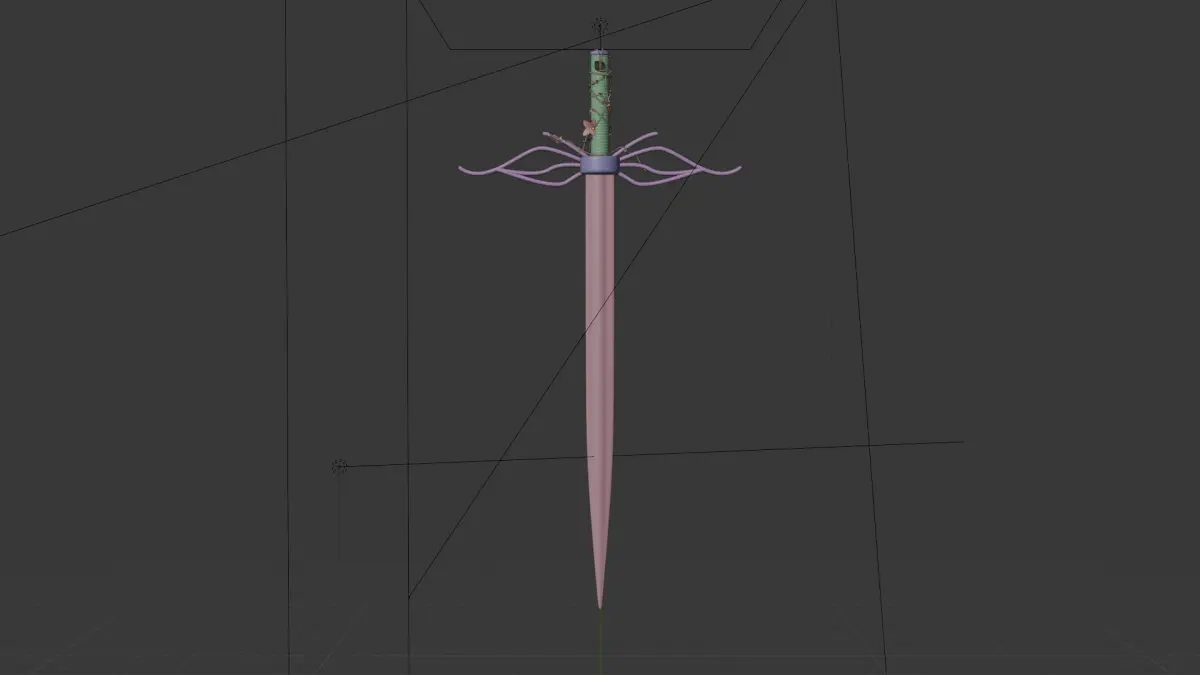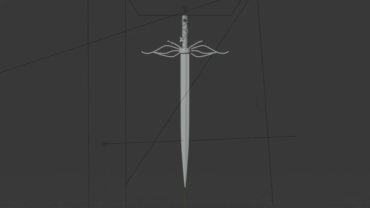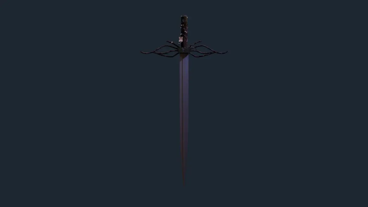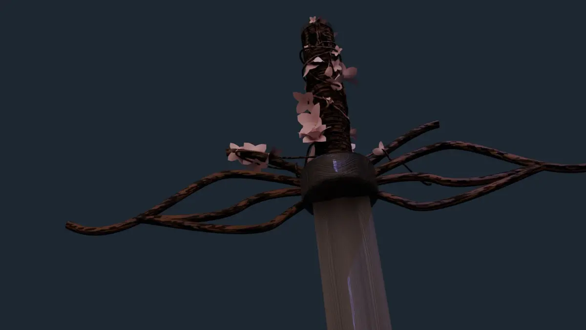 The scene consists of a sword with a long, tapering blade, a stylized twisted vine-like crossguard, and a leather-wrapped handle. The sword design is ideal for use in dark fantasy, medieval, or RPG-themed projects, either as a game asset or part of a cinematic environment.