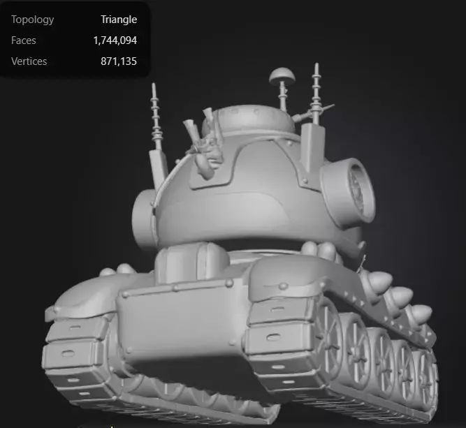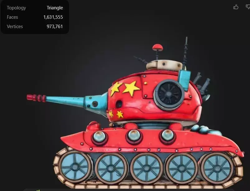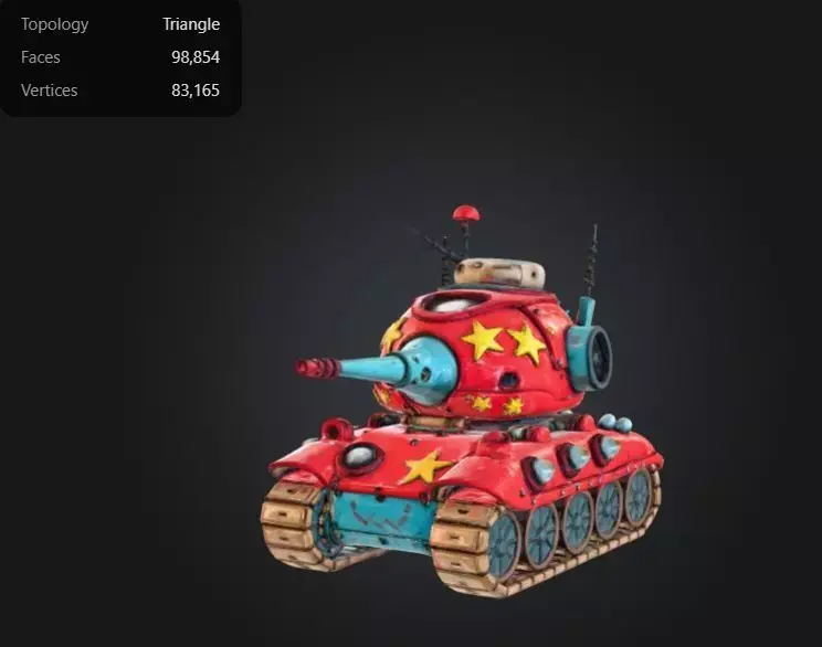 Stylized Cartoon Tank – High-Poly 3D Model (Color + Grayscale Variants)This playful, high-resolution tank model blends military form with whimsical design, perfect for stylized games, animated shorts, or collectible figure prototyping. Sculpted using Meshy AI’s full suite of tools, it features exaggerated proportions, vibrant surface details, and clean topology.• Topology: Triangle mesh• Faces: 1,744,094• Vertices: 871,135• Rigging: Not rigged• UVs: Fully unwrapped and ready for texture customization• Variants Included:• Full-color version with red body, blue cannon, yellow stars, and decorative accents• Grayscale sculpt for clean geometry inspection and stylized shader work• Style: Cartoon realism with toy-like proportions and expressive surface features• Use Cases: Ideal for stylized war games, animated series, mobile apps, • Format: [Specify file format—e.g., .obj, .fbx, .glb]• Compatibility: Works with Blender, Maya, Unreal Engine, Unity, and other major platformsThis tank is designed to stand out in playful or exaggerated environments, offering both visual charm and technical polish. Whether it’s rolling into battle or starring in a cutscene, it’s ready to deploy. comes with a texture variant for pvp play
