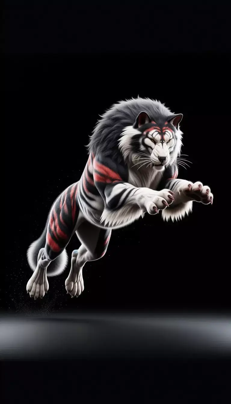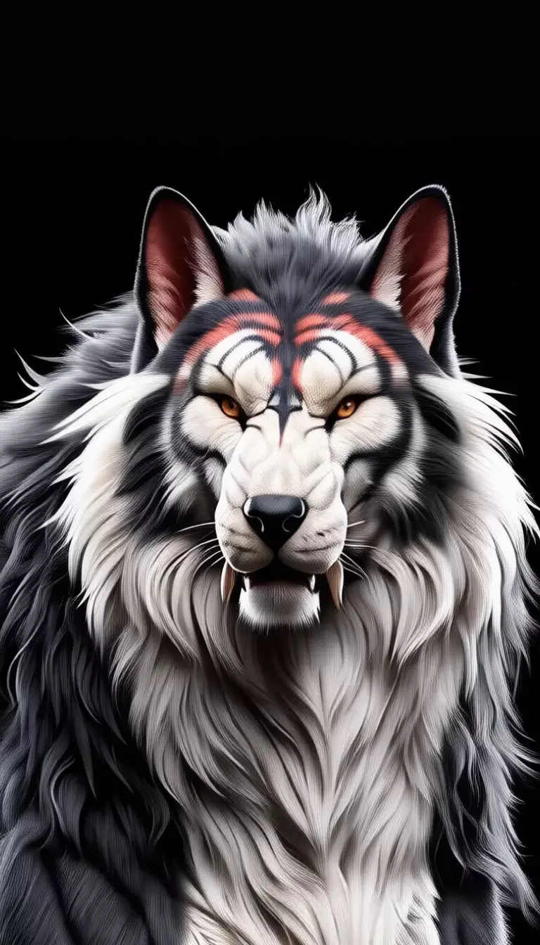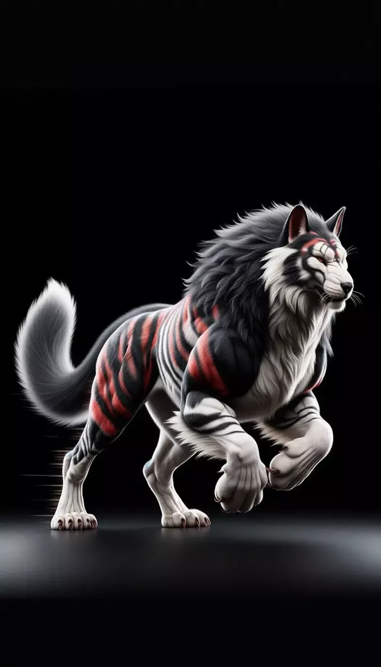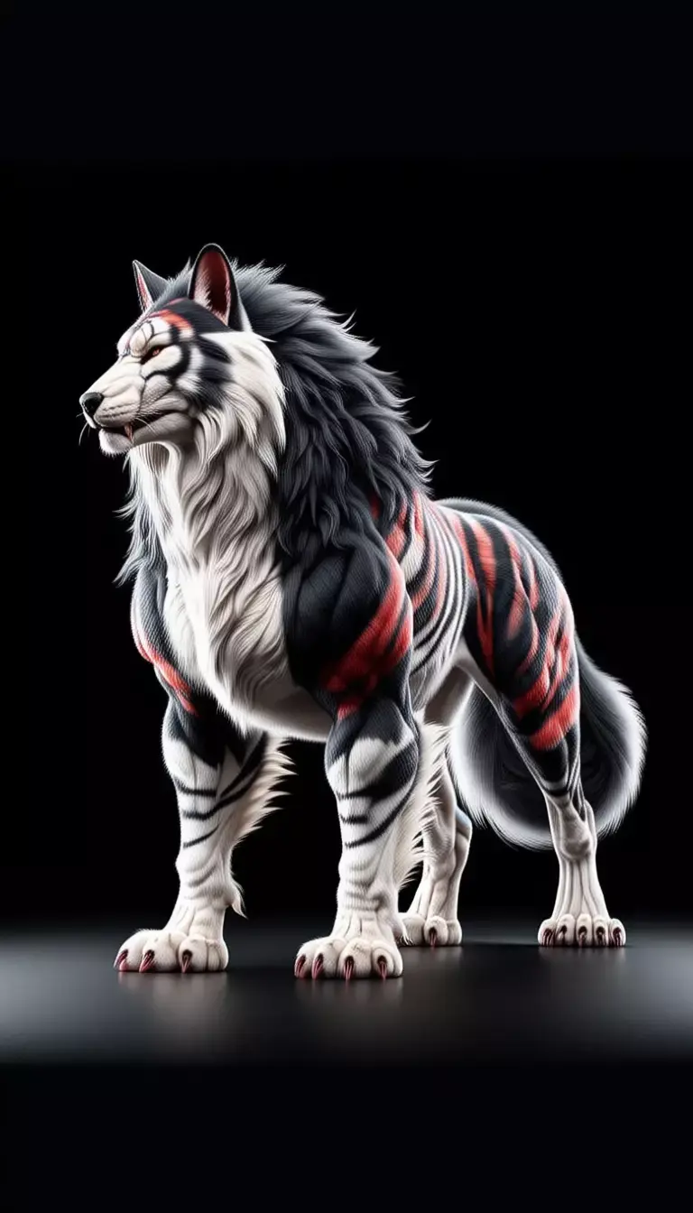 This breathtaking 3D render showcases a mythical hybrid creature, blending the majestic power of a tiger with the wild spirit of a wolf — resulting in a truly unique and awe-inspiring fantasy beast. The creature stands poised on a glossy black surface against a pure black backdrop, its muscular form radiating strength and primal energy. Its fur is a mesmerizing fusion: thick, flowing white and gray mane reminiscent of a lion or dire wolf, contrasted with bold, fiery red-and-black tiger stripes that ripple across its shoulders, flanks, and legs. The face combines feline structure with canine intensity — sharp amber eyes glow with inner fire, while its snout is slightly elongated, revealing subtle fangs and a hint of aggression.