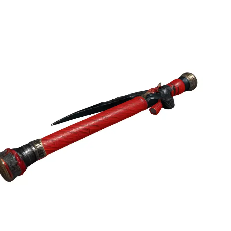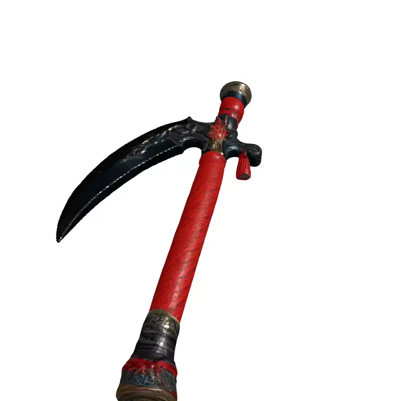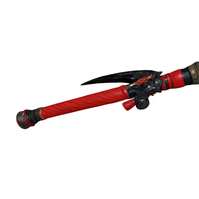 This 3D model depicts a stylized fantasy war scythe, featuring a curved blade and a long handle wrapped in red cord. Ideal for game development, especially RPGs or fantasy titles, this asset can also be used in other applications such as cinematic renders, digital art, and potentially 3D printing. The model is available in multiple file formats, including GLB, OBJ, FBX, and STL. It's optimized for real-time use in game engines, featuring a low-poly count while maintaining a high level of detail. Key features include clean topology, UV unwrapped meshes, and PBR textures for realistic rendering. The blade exhibits intricate engravings, and the handle has detailed metal and cord elements. The scythe is ready for integration into game projects or can be further customized to fit specific art styles. The red wrapping adds a distinct visual appeal, suggesting a unique lore or character association. This model provides a visually compelling weapon for any fantasy setting.