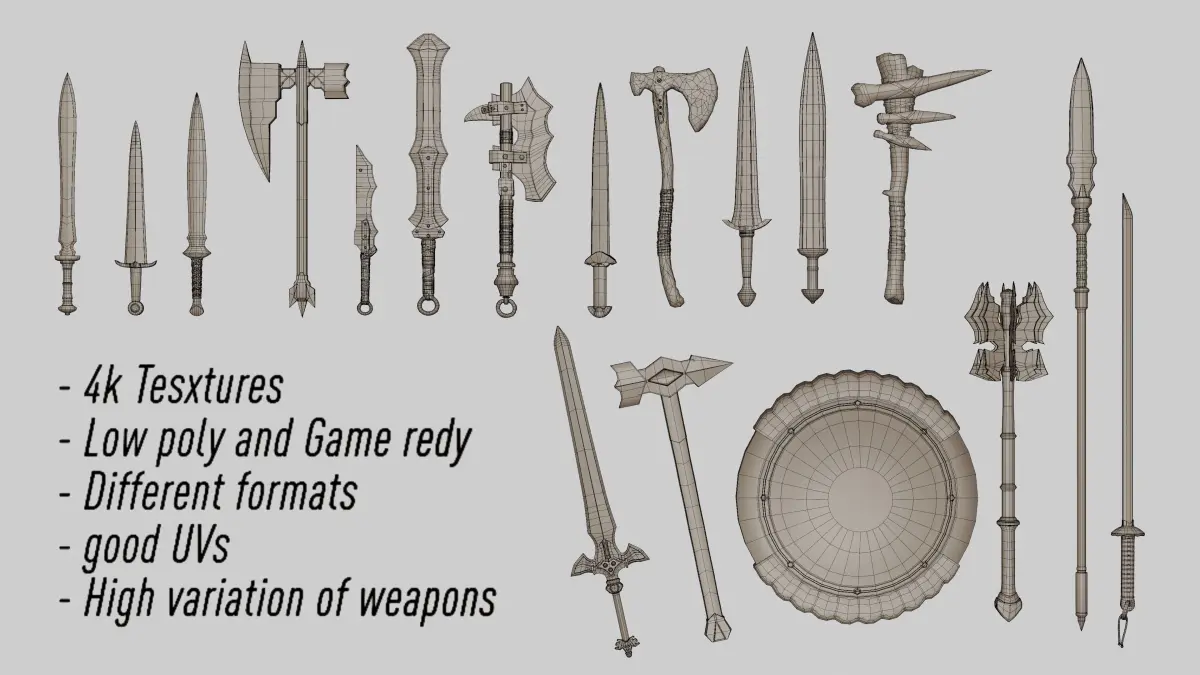 - Description: Hello, I hope you are well. This pack contains 19 weapon models and has different weapons for different tasks, such as a knight's mace and a samurai sword. All models are low poly and You can use them in different projects, they also have 4k textures and were placed in different formats on the site