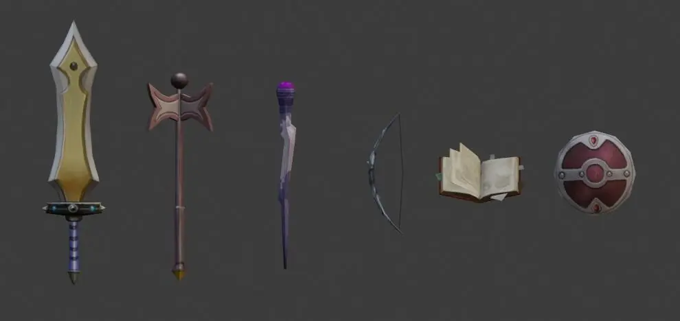 low poly fantasy weapons fully textured mobile ready just drag and drop into unity or unreal engine.This Fantasy Weapon Pack Contains Following assets:PolyCountSword = 252 trisAxe = 264 trisMagic Stick = 184 trisBow = 118 trisShield = 72 trisMagic Book = 176 tris