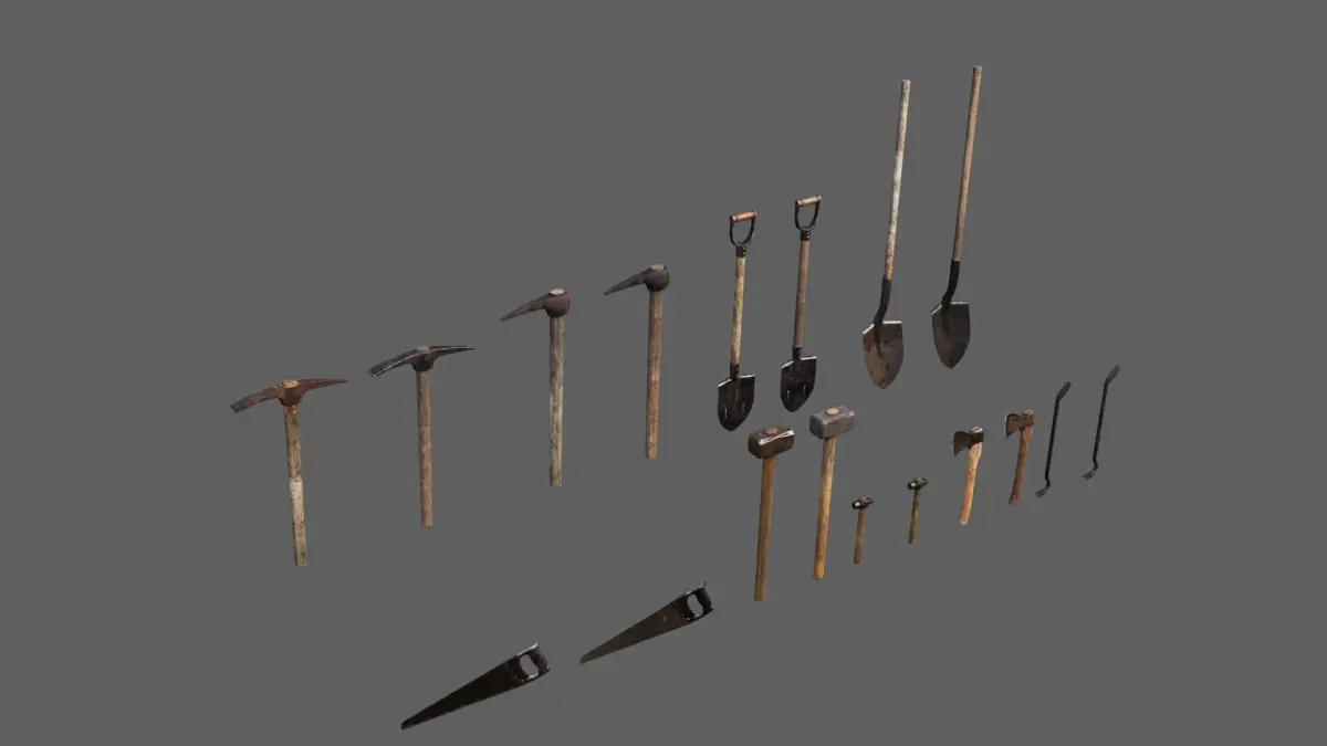 A curated collection of 9 realistic old tools, perfect for construction sites, workshops, or mining scenes. The pack includes shovels, hammers, pickaxes, crowbars, saws, and an axe — all worn, rusted, and ready for use in gritty environments.Each model is low-poly and optimized for real-time use, with clean topology (3553 vertices, 6950 triangles total) and efficient UVs. Two unique 2K PBR texture sets are provided for each model: clean(er) and dirty/heavily used.