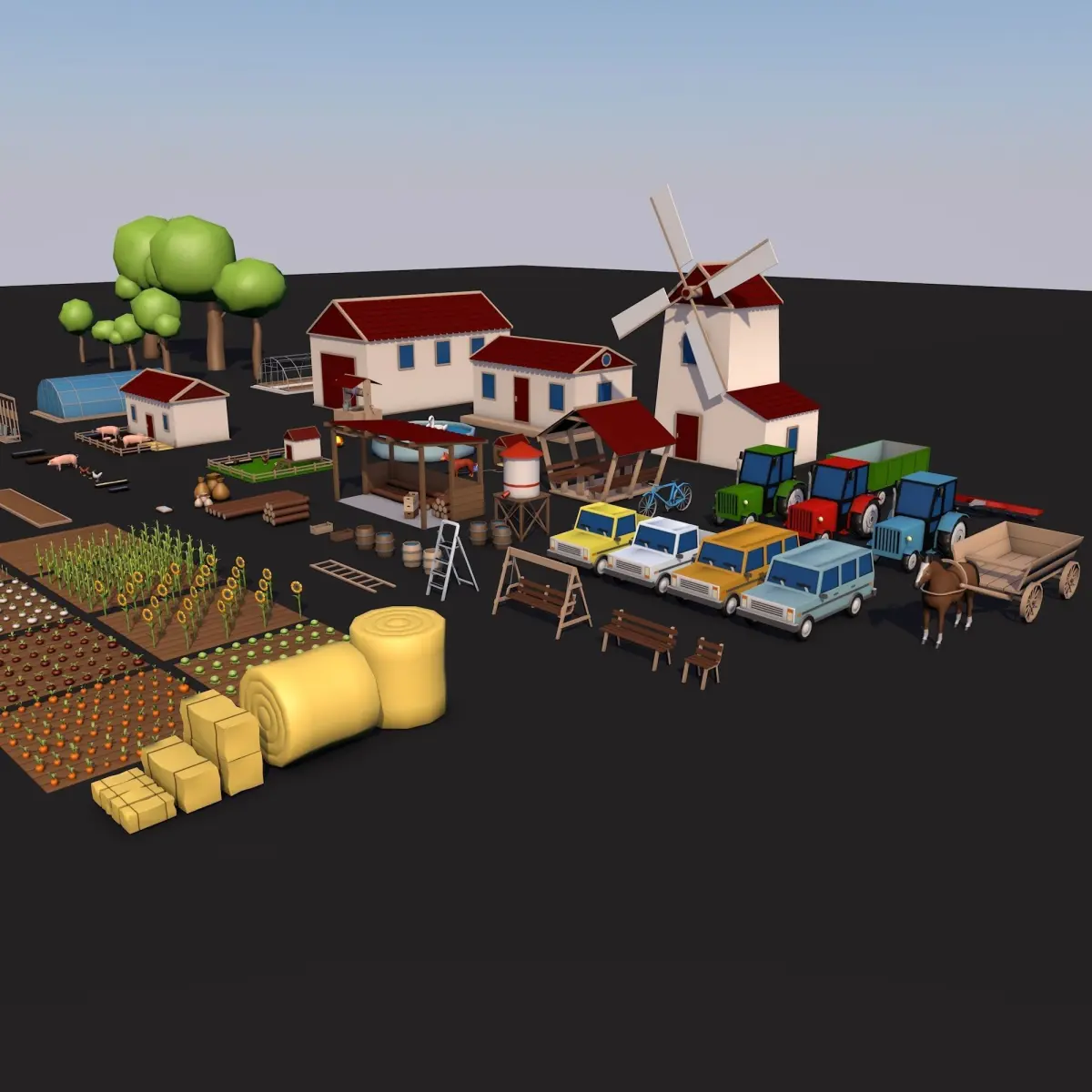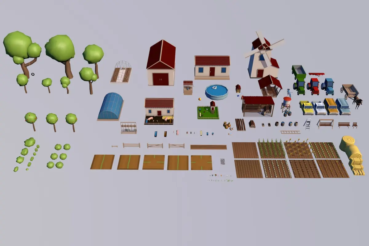 The farm collection contains 154 unique objects. The set included a house, a barn, a mill, a pigsty, a chicken coop, a warehouse, tractors, cars, a bicycle, a cart with a horse, trailers, fields with vegetables, fences, roads. bushes, trees, flowers, grass...