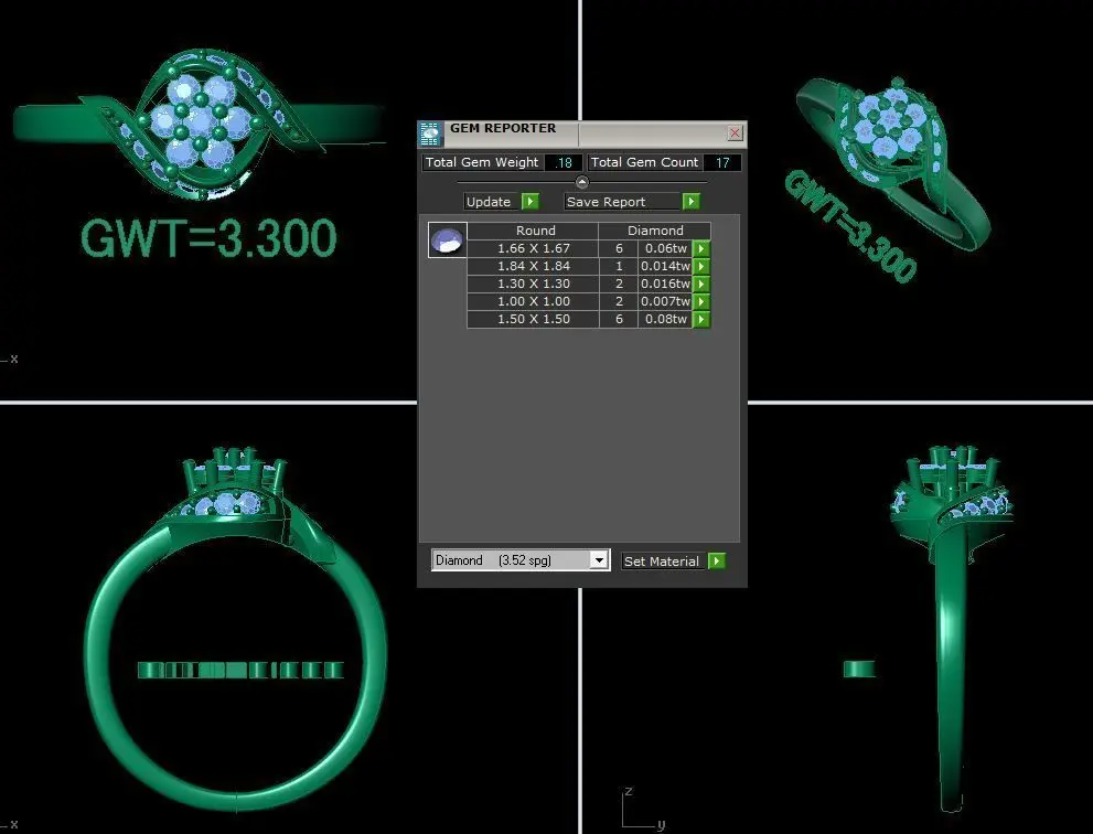 In the center is a GEM REPORTER window that provides detailed information about the diamonds in the ring: