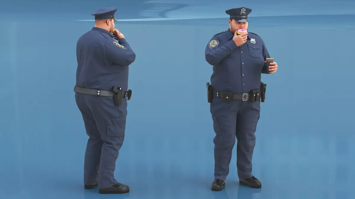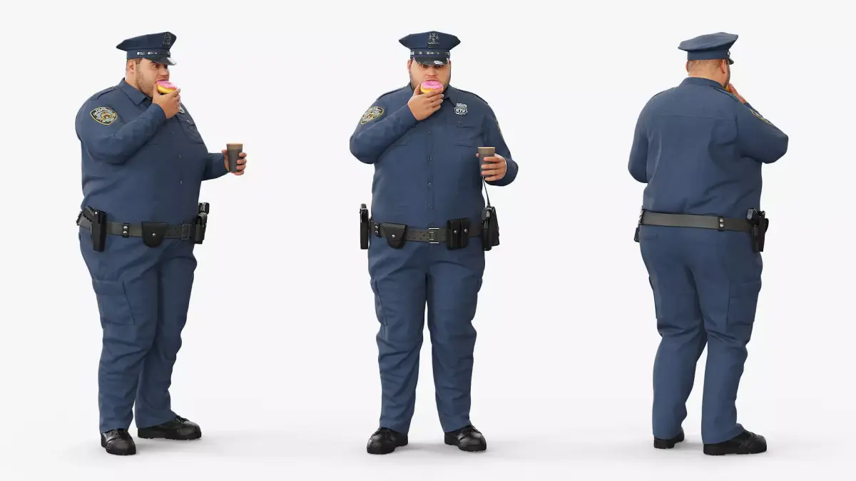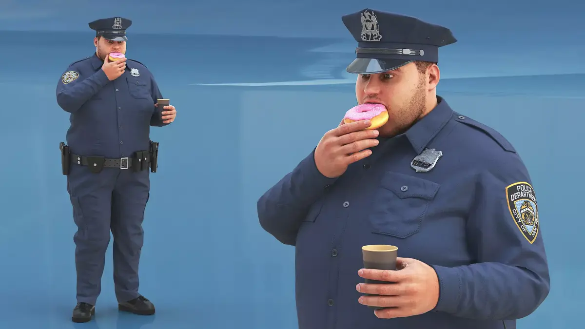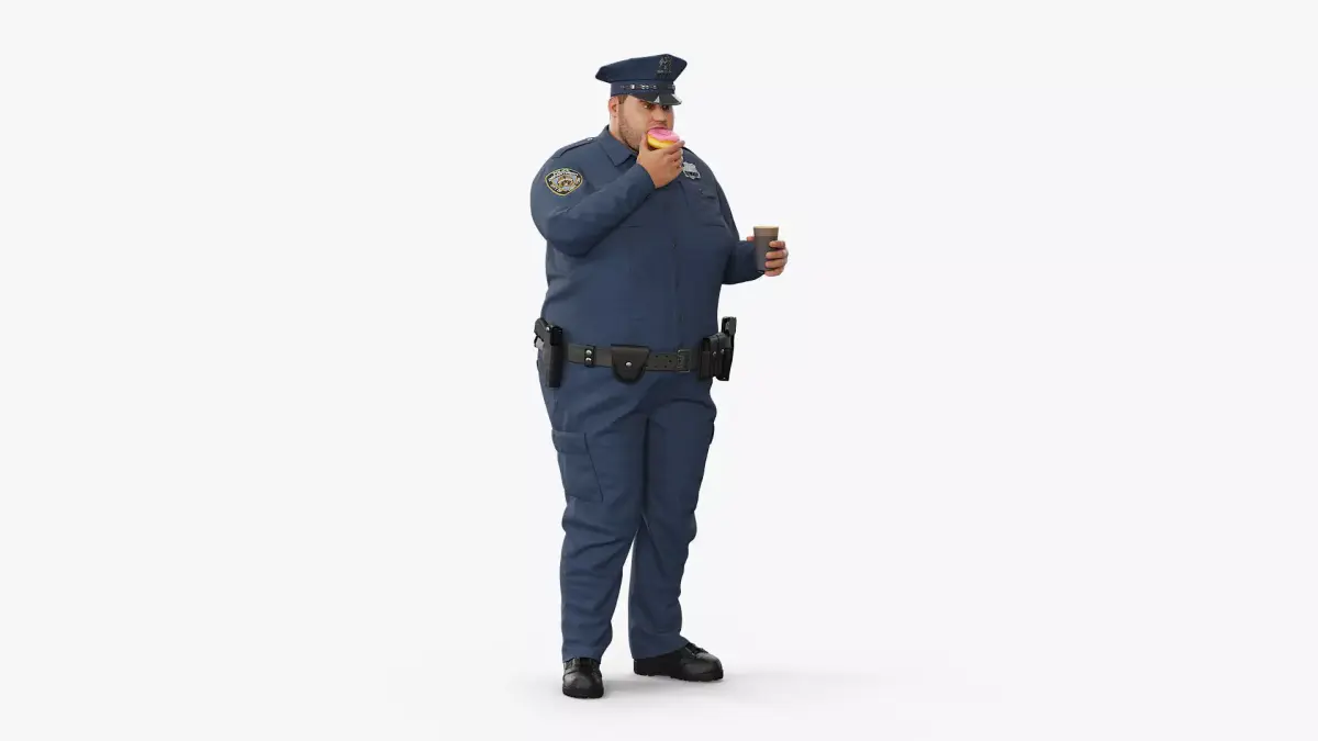 Fat NYPD Cop with Coffee and Donut Fur is a 3d model of police officer enjoying a donut, a playful nod to popular culture.