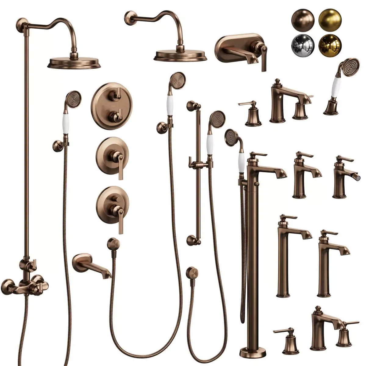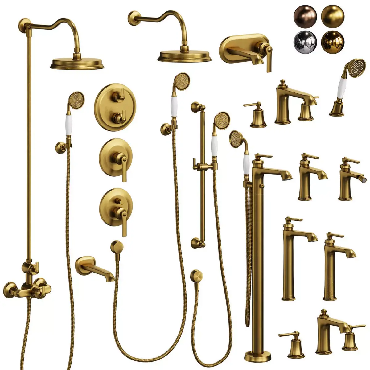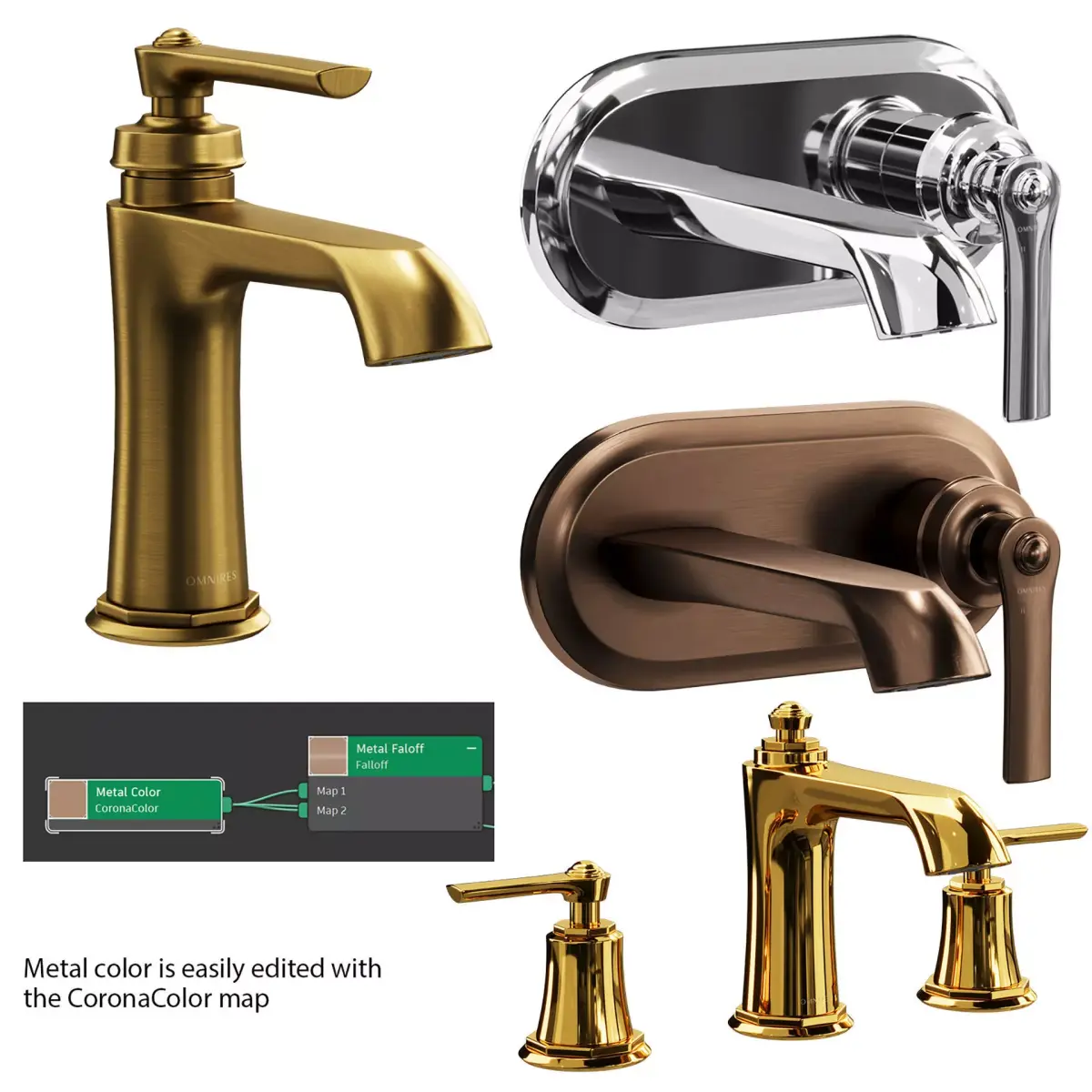3ds Max faucets are available in 4 colors: gold brushed matt, chrome, bronze, gold gloss. If necessary, the metal color can be easily edited by changing the color of the Color Node.Blender and Cinema 4d available in chrome color without labels, the color of the faucets is also easy to change.