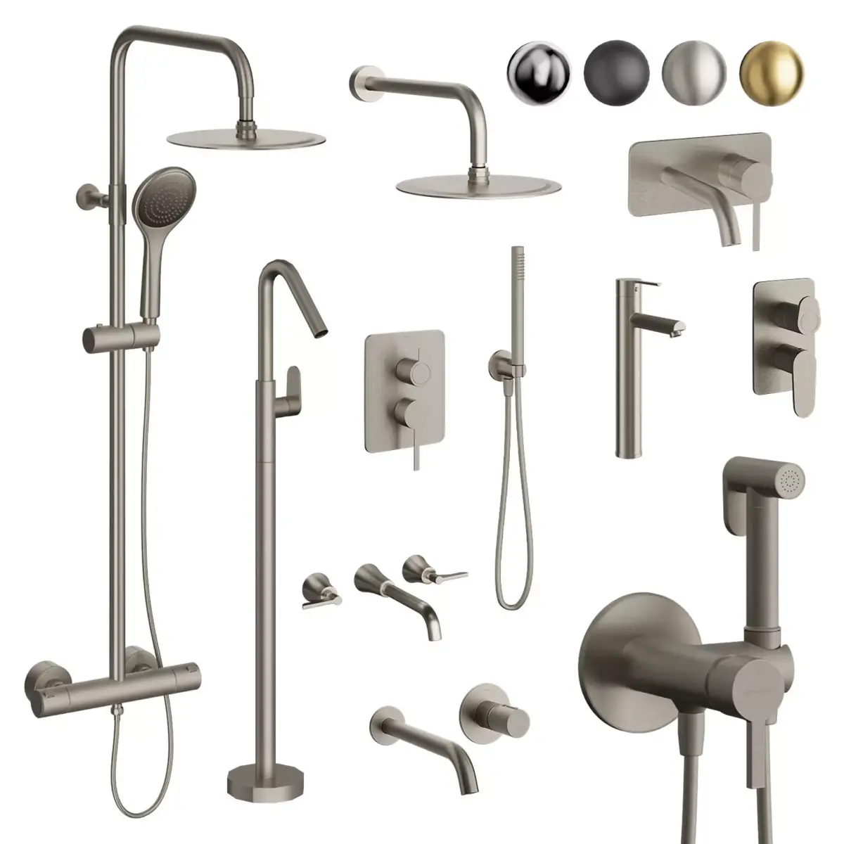 The set contains:Ramonsoler Drako Sink FaucetRamonsoler DRAKO Built-in sink FaucetRamonsoler Drako shower system, thermostaticRamonsoler Drako shower system, with shower setHygienic shower Ramonsoler DrakoFloor Mounted sink Faucet Ramonsoler AlexiaBuilt-in shower faucet with 2 Alexia outletsRamonsoler Adagio Sink FaucetRamonsoler Tzar Sink Faucet