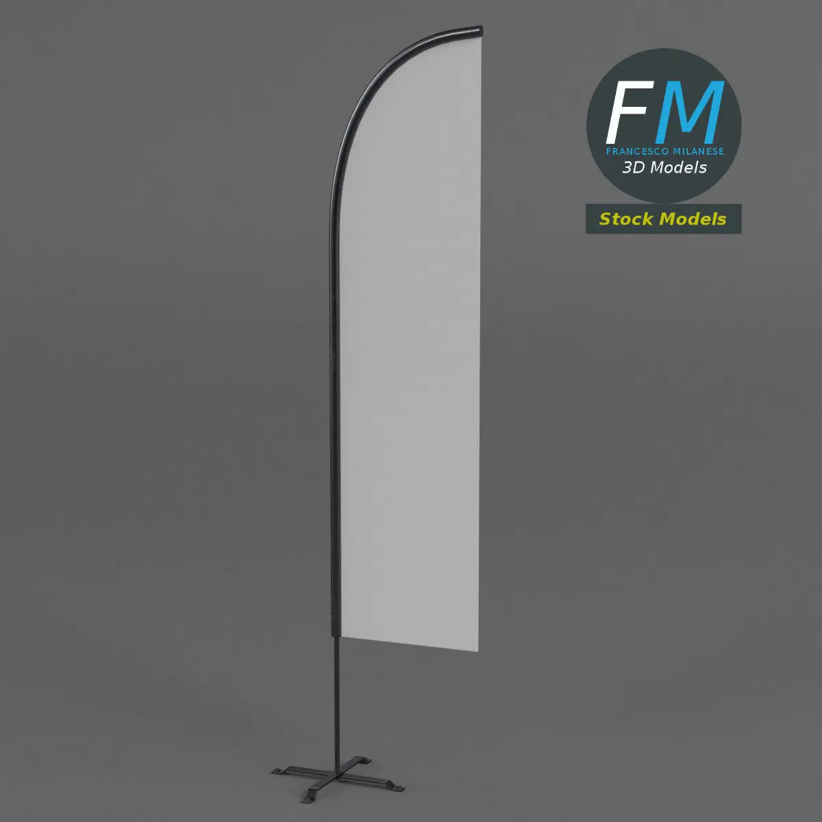 Feather flag 3D Model. 2 objects (frame, flag), each one with its own non overlapping UV Layout map, Material and PBR Textures set. Production-ready 3D Model, with PBR materials, textures, non overlapping UV Layout map provided in the package.