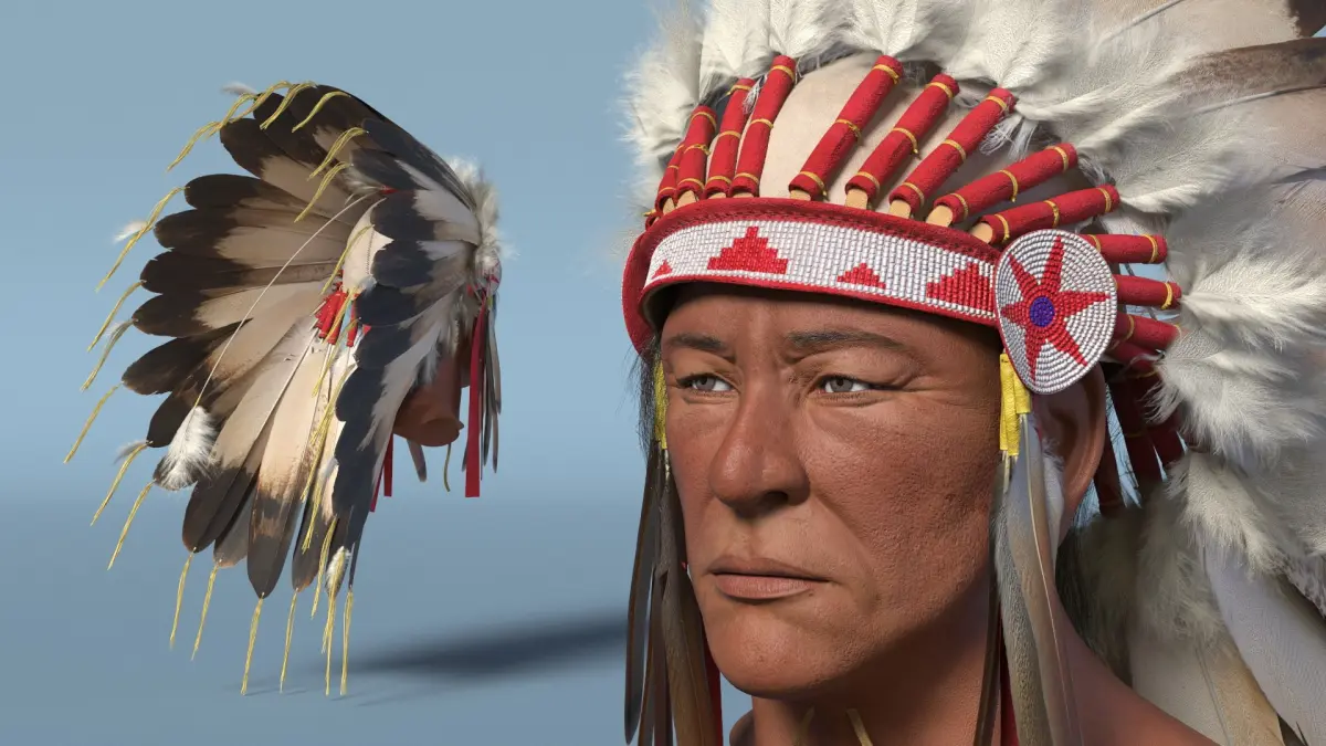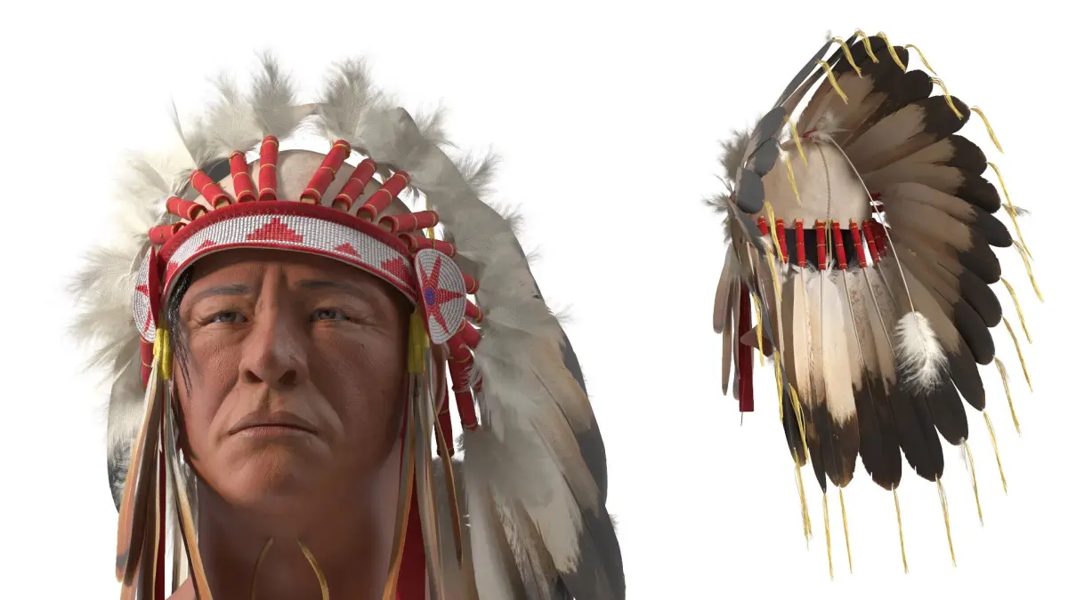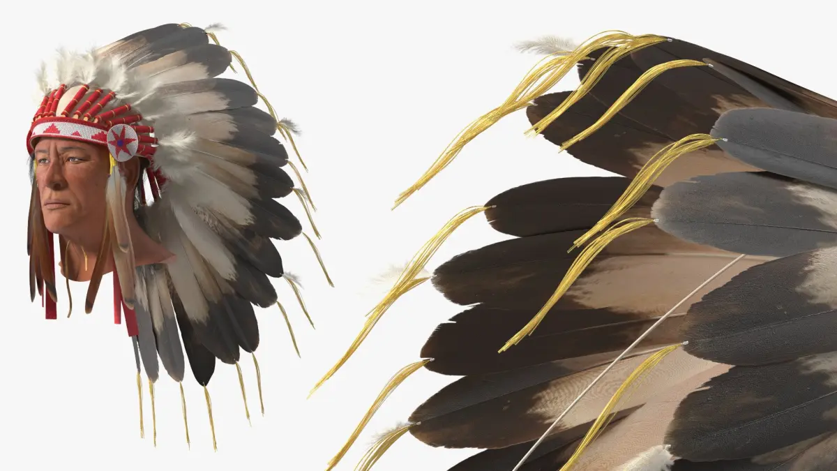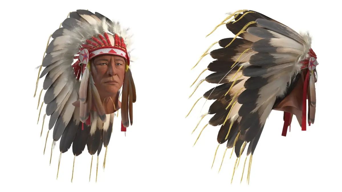 Feather Headdress on Elderly Man with Red is a 3d model of a traditional indigenous headdress, often worn by Native American leaders and warriors in ceremonial events.