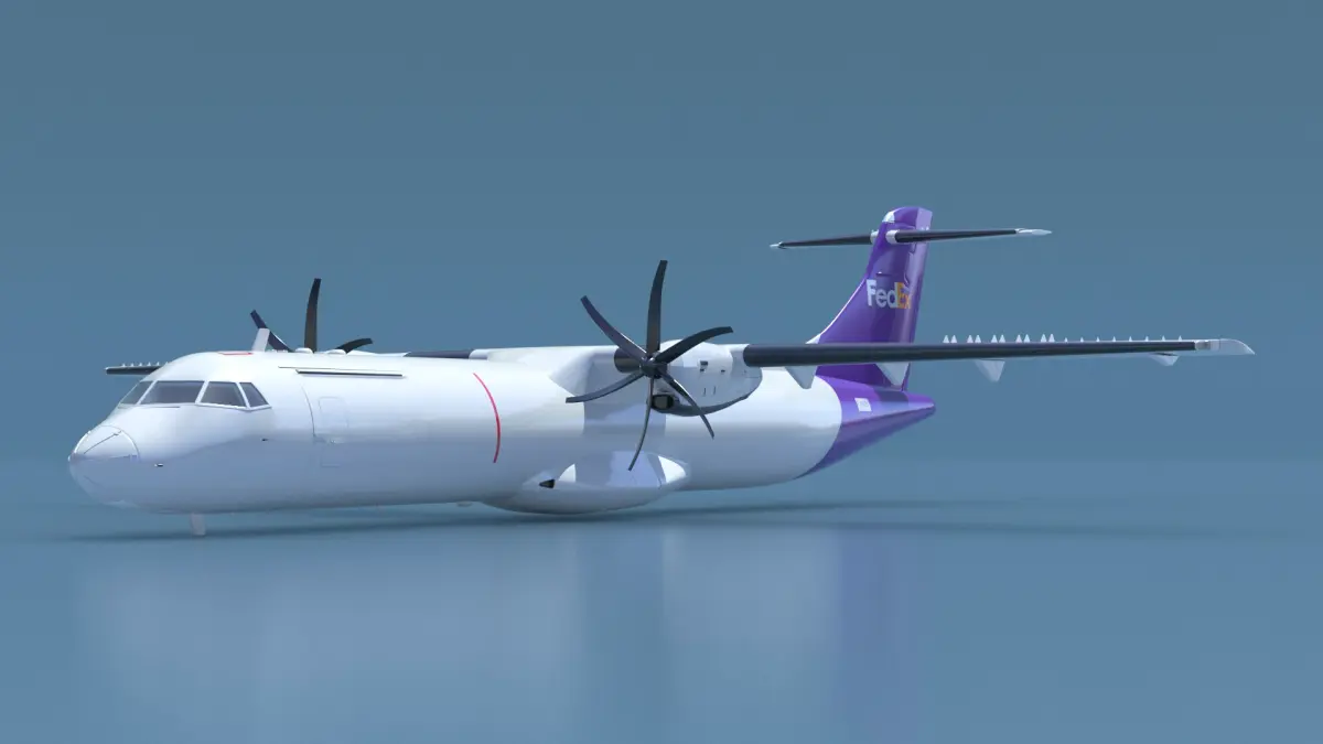 This model features realistic details, including the twin-engine turboprop design, FedEx livery, and cargo hold specifications. It accurately represents the ATR 72's unique structure, known for efficiency in regional cargo transport. The model includes detailed propellers, wings, and tail sections, showcasing its aerodynamic design.