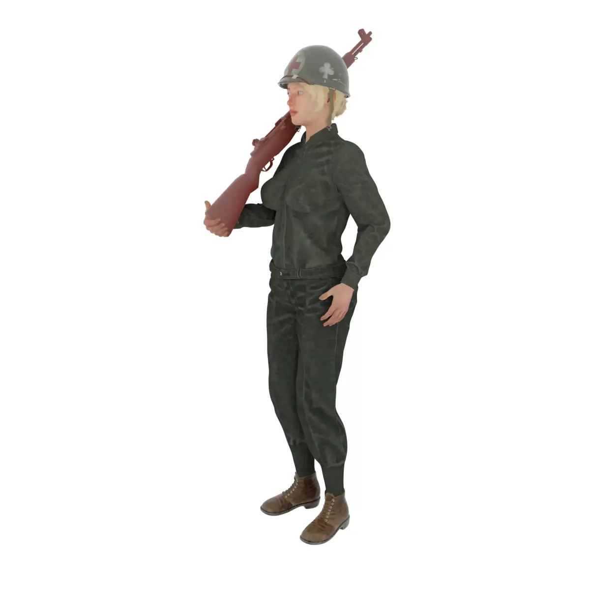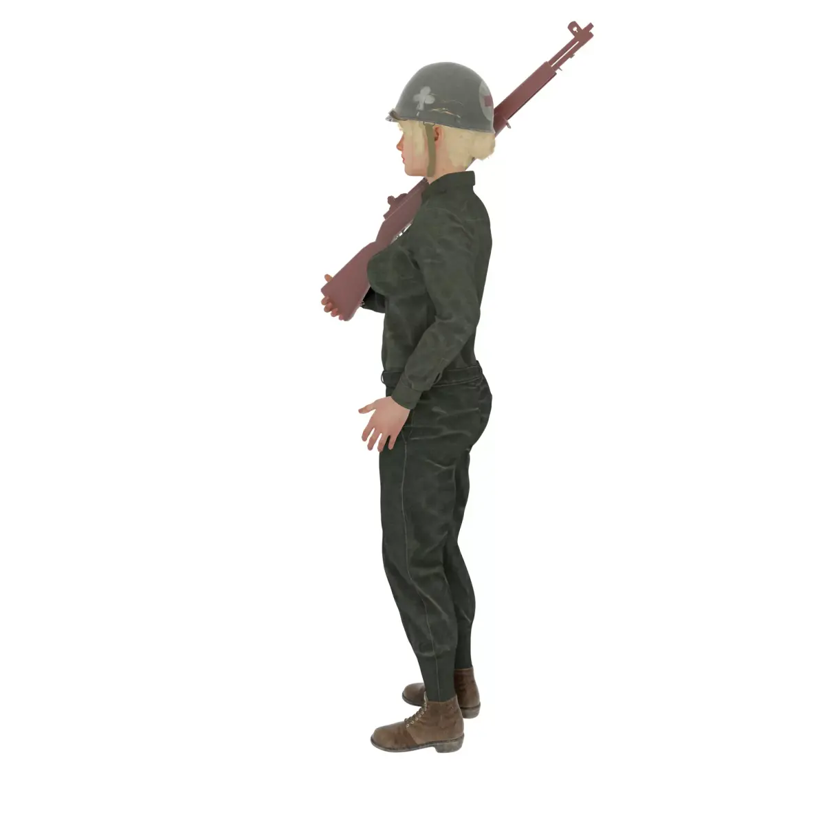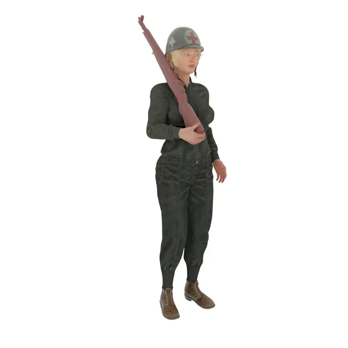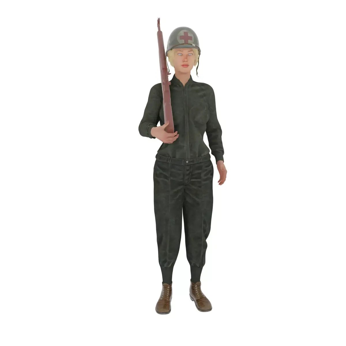 An adult female character rendered as a realistic 3D model, standing upright while holding a rifle across her body. She wears a vintage military-style uniform consisting of a fitted jacket, matching trousers, lace-up boots, and a steel helmet marked with a medical insignia, suggesting a combat medic role. Her posture is steady and alert, with practical clothing and gear designed for functionality rather than decoration. The overall presentation emphasizes historical military aesthetics, detailed fabric textures, and a grounded, realistic character design suitable for games, dioramas, or collectible figures.