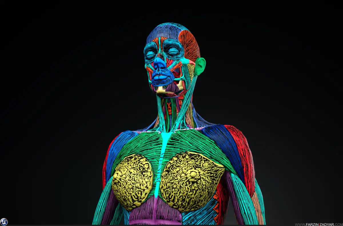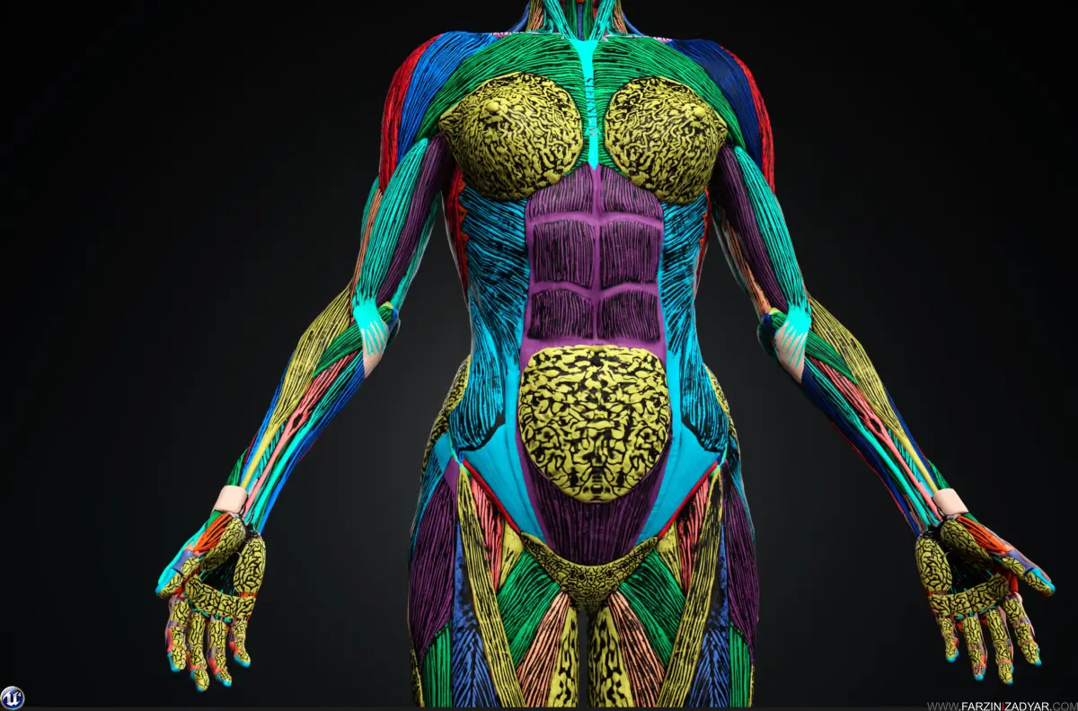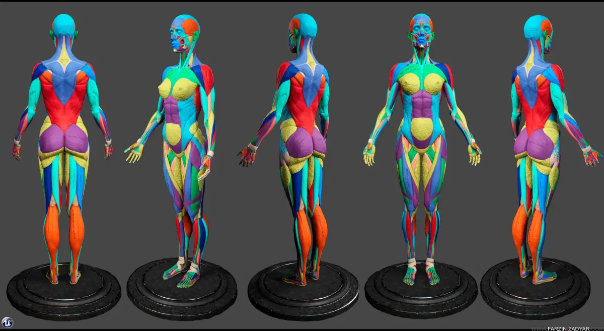 3D Female anatomy model is here and its a great learning companion with all the muscles and bones named. There is also Colour-code included in this package as well as muscles striation.