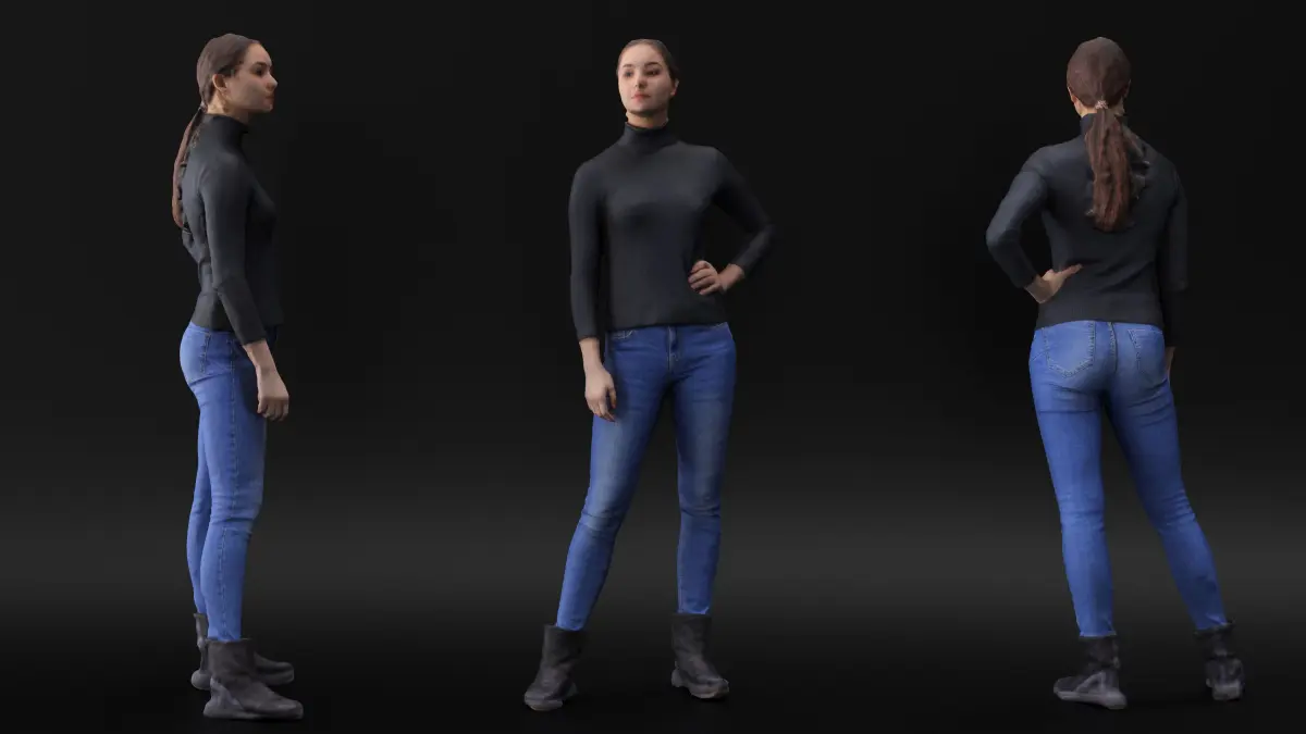 This is a true human size and detailed model of a sporty beautiful young woman of Caucasian appearance dressed in casual style. The model is captured in casual pose to be perfectly matching for variety of architectural visualizations, e.g. urban installations, city designs, outdoor design presentations etc.