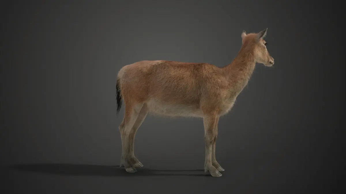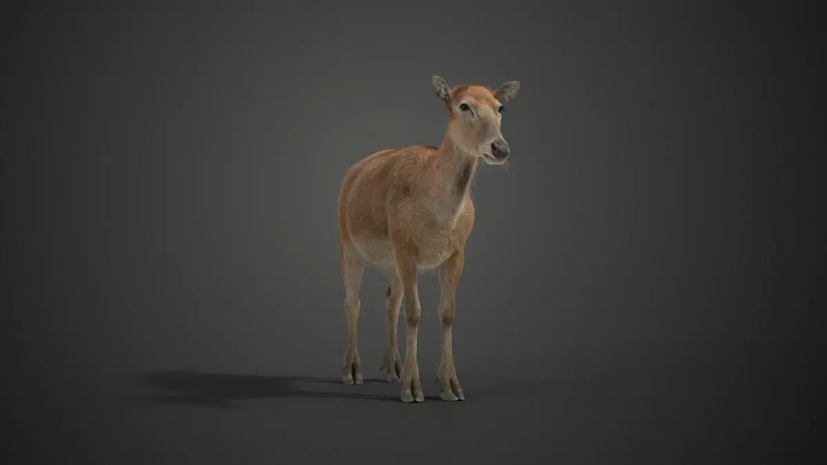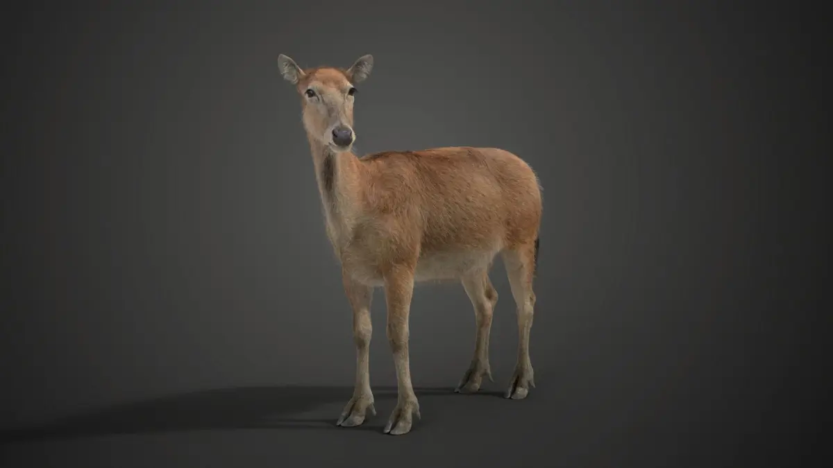 This is a high-quality female Pere David's Deer model with textures in the UDIM format partially, rigging and animation. It has very detailed muscle structures and a realistic oral cavity. The model is made with Blender and Cycles renderer at real-world scale.