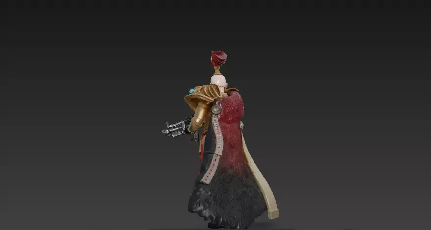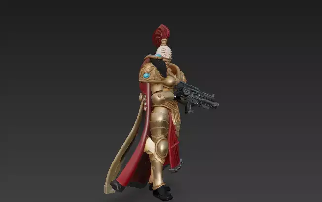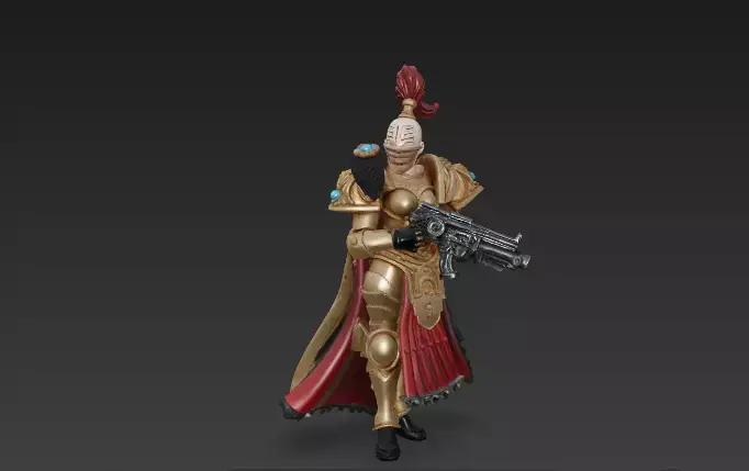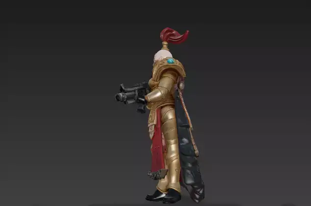 This highly detailed sci-fi warrior 3D model features a heavily armored soldier equipped with an intricate energy rifle, ornate golden-red armor, and a commanding presence perfect for futuristic or fantasy projects. The model combines regal design elements with tactical combat aesthetics, making it suitable for use in games, animations, cinematic renders, or collectibles.