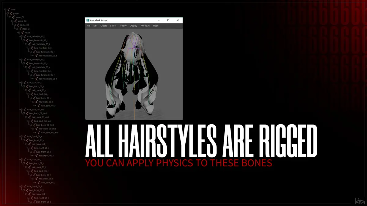 Hairstyles are rigged and you can apply physics via these bones. It is advised to use KawaiiPhysics (not included) for the best-looking results.