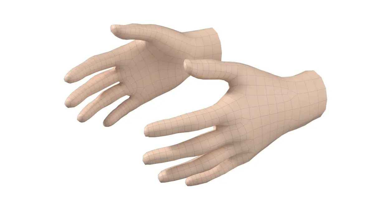 3D model of of female hands in relax neutral pose, as low-poly base mesh.