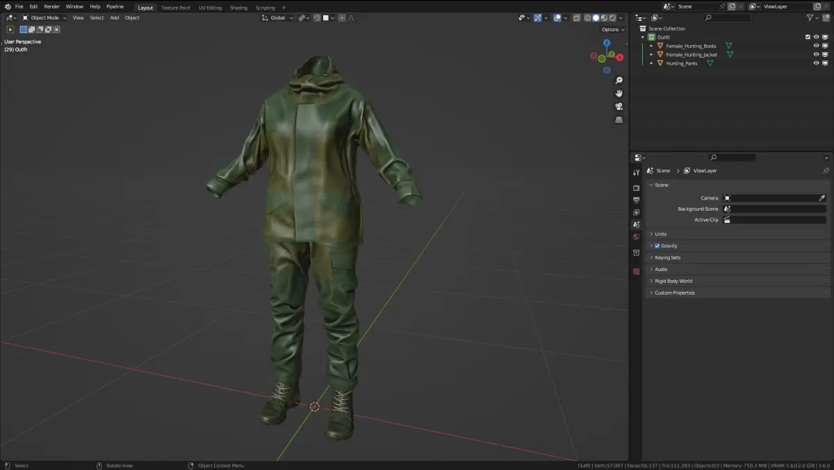 Unreal Engine and Blender version with a body (Rigged) - https://www.cgtrader.com/3d-models/character/clothing/woman-hunting-outfit-modular-rigged