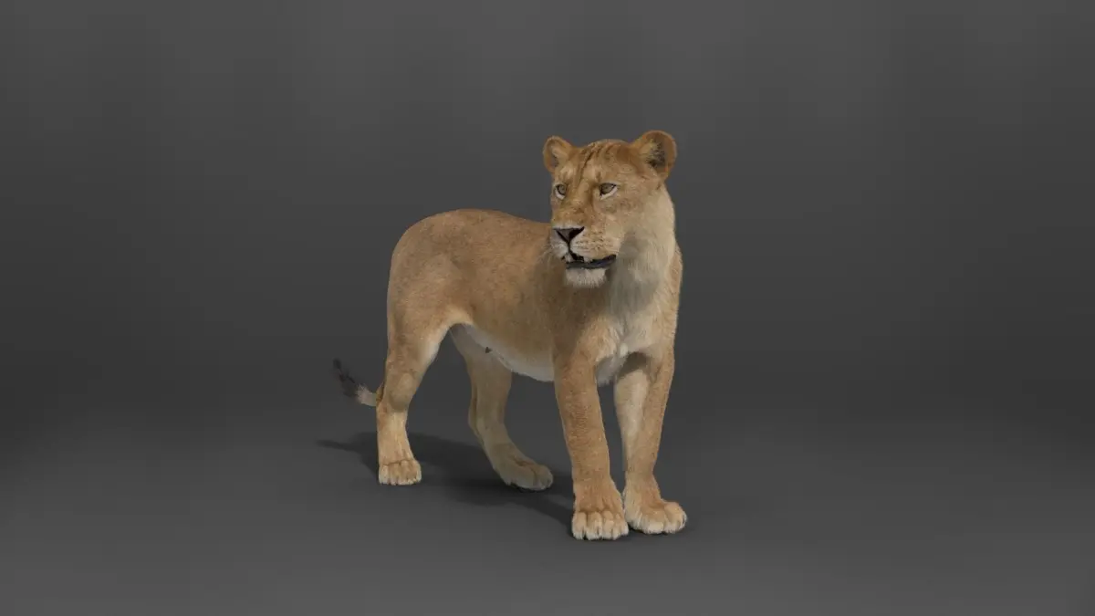 This is a female lion model with textures, fur, rigging and animation. The model has realistic muscle structure and 4K UDIM maps, and there is fine facial rigging. The model is made with Blender and Cycles renderer at real-world scale.