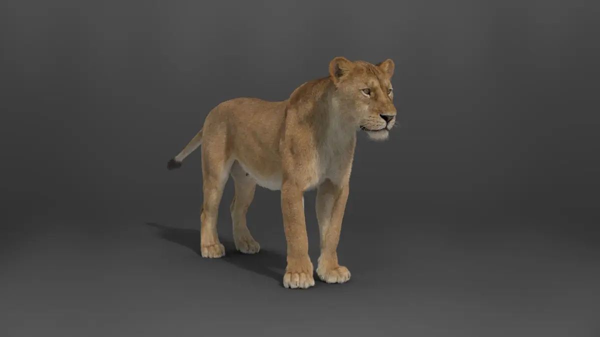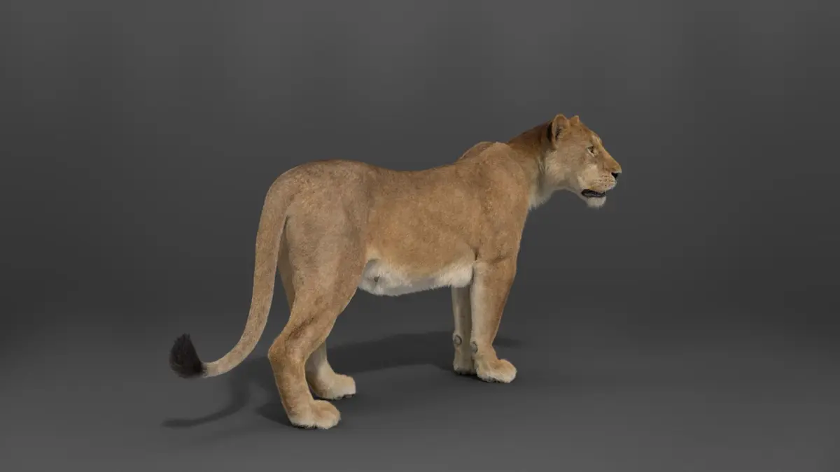This is a female lion model with textures, fur, rigging. The model has realistic muscle structure and 4K UDIM maps, and there is fine facial rigging. The model is made with Blender and Cycles renderer at real-world scale.