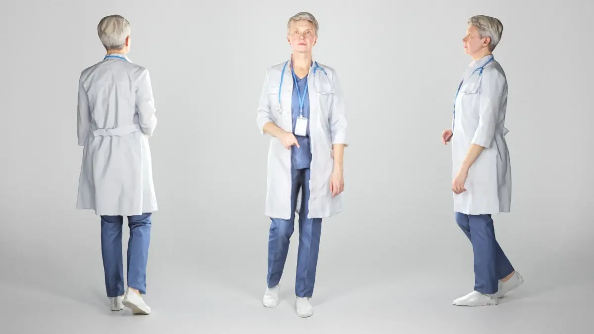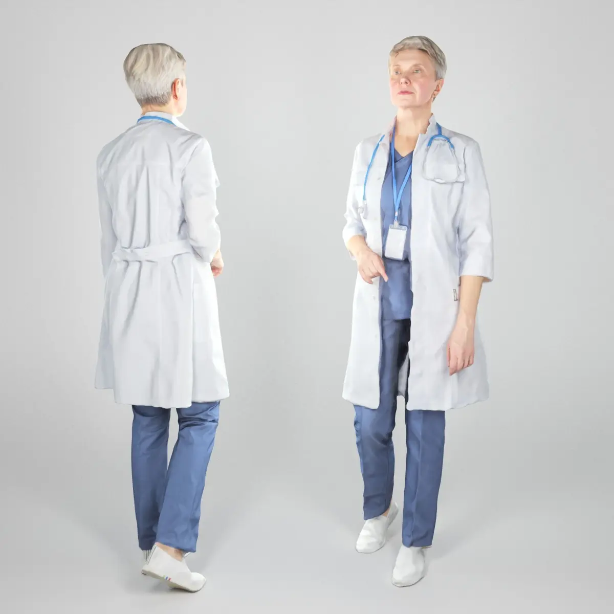 This is a true human size and detailed model of a beautiful adult woman of Caucasian appearance dressed in a uniform of a medical doctor. The model is captured in casual pose to be perfectly matching to variety of architectural visualization, background character, product visualization, e.g. advert banners, professional products/devices presentations, etc.