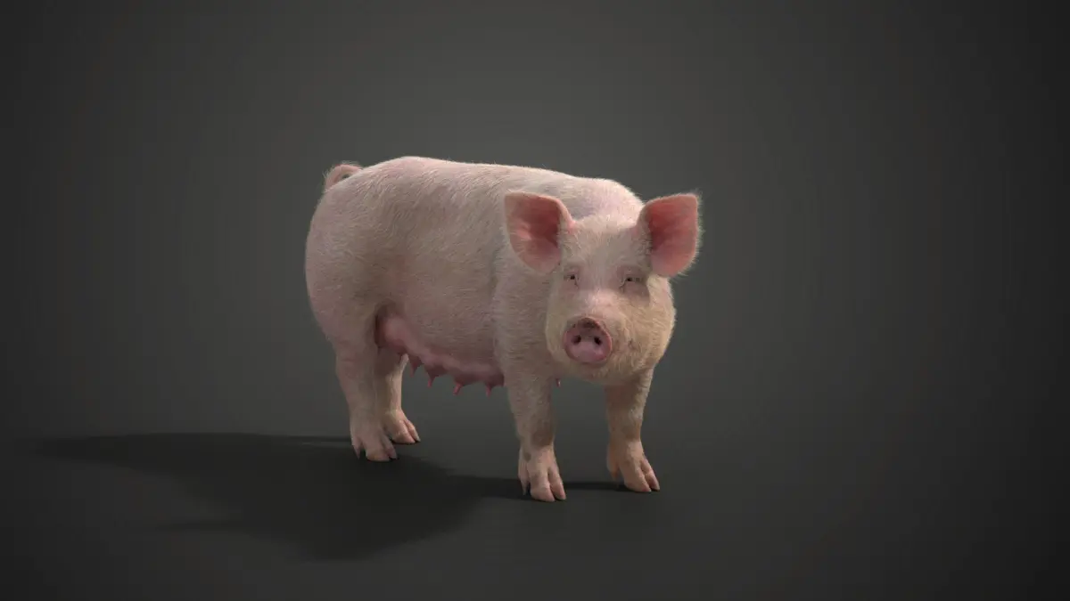 This is a high-quality female large white pig model with multiple 4K textures, fur, rigging, and animations, and it's made with Blender and Cycles renderer at real-world scale. The skin texture and the hair texture are made separately for realism. Besides, 3 loopable animations and 2 unlooped animations are available.