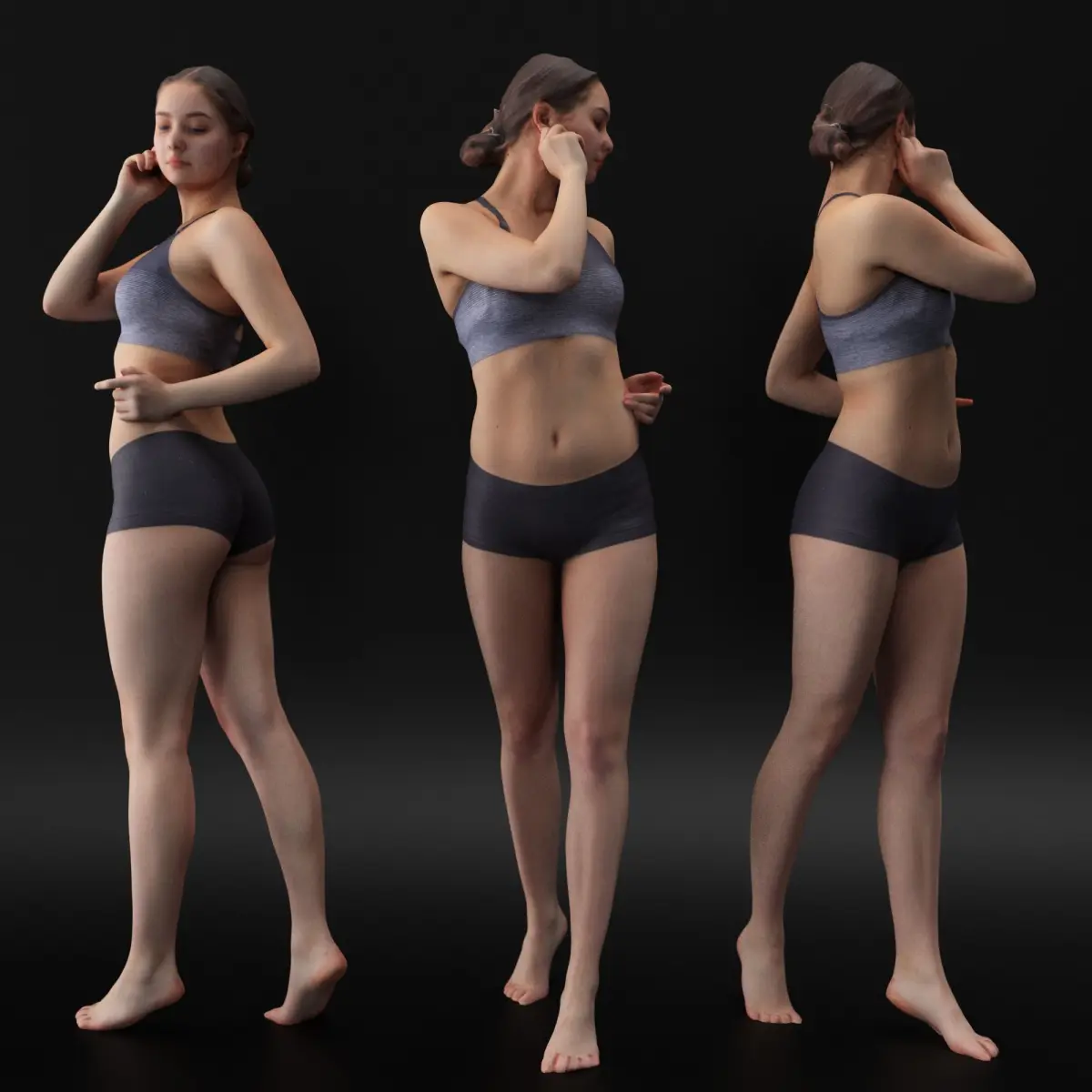 This is a true human size and detailed model of a sporty beautiful young woman of Caucasian appearance. The model is captured in casual pose to be perfectly matching for variety of architectural visualizations, e.g. sport ground, gym, beach, etc. The product is ready for immediate use in architectural visualisations, for further render and detailed sculpting in Zbrush.