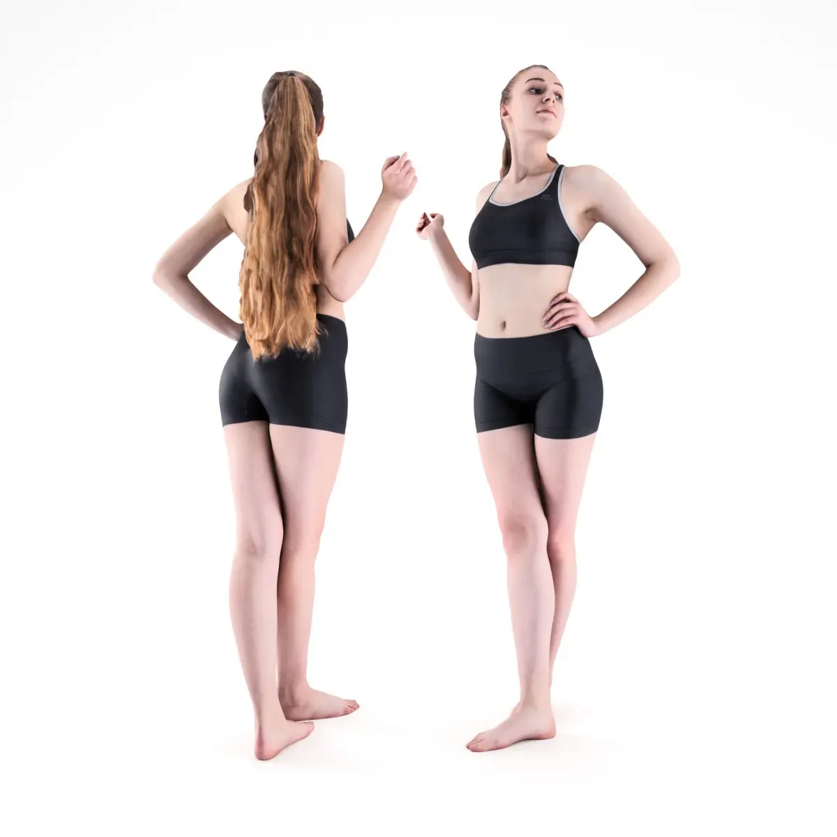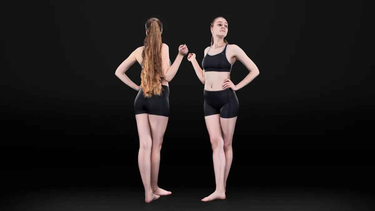 This is a true human size and detailed model of a sporty beautiful young woman of Caucasian appearance. The model is captured in casual pose to be perfectly matching for variety of architectural visualizations, e.g. sport ground, gym, beach, etc.