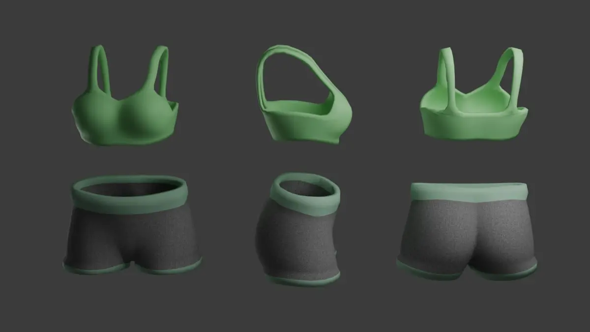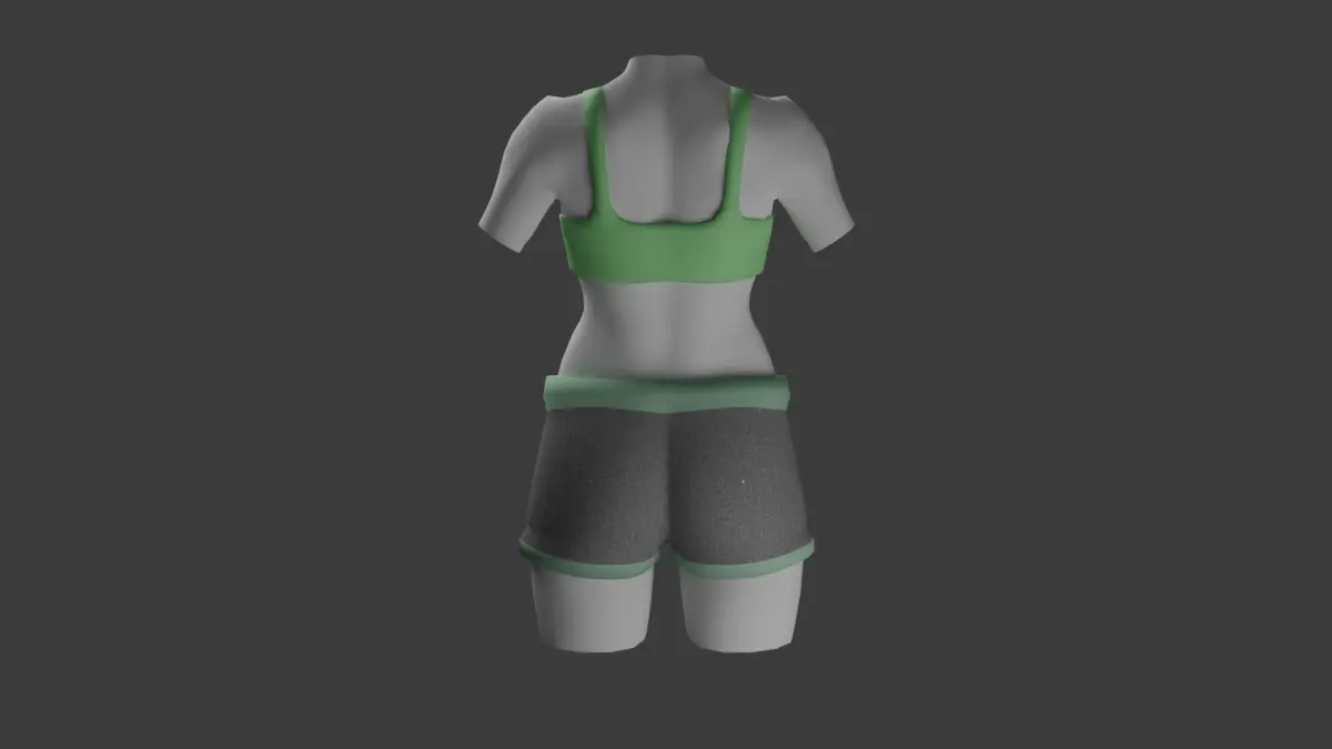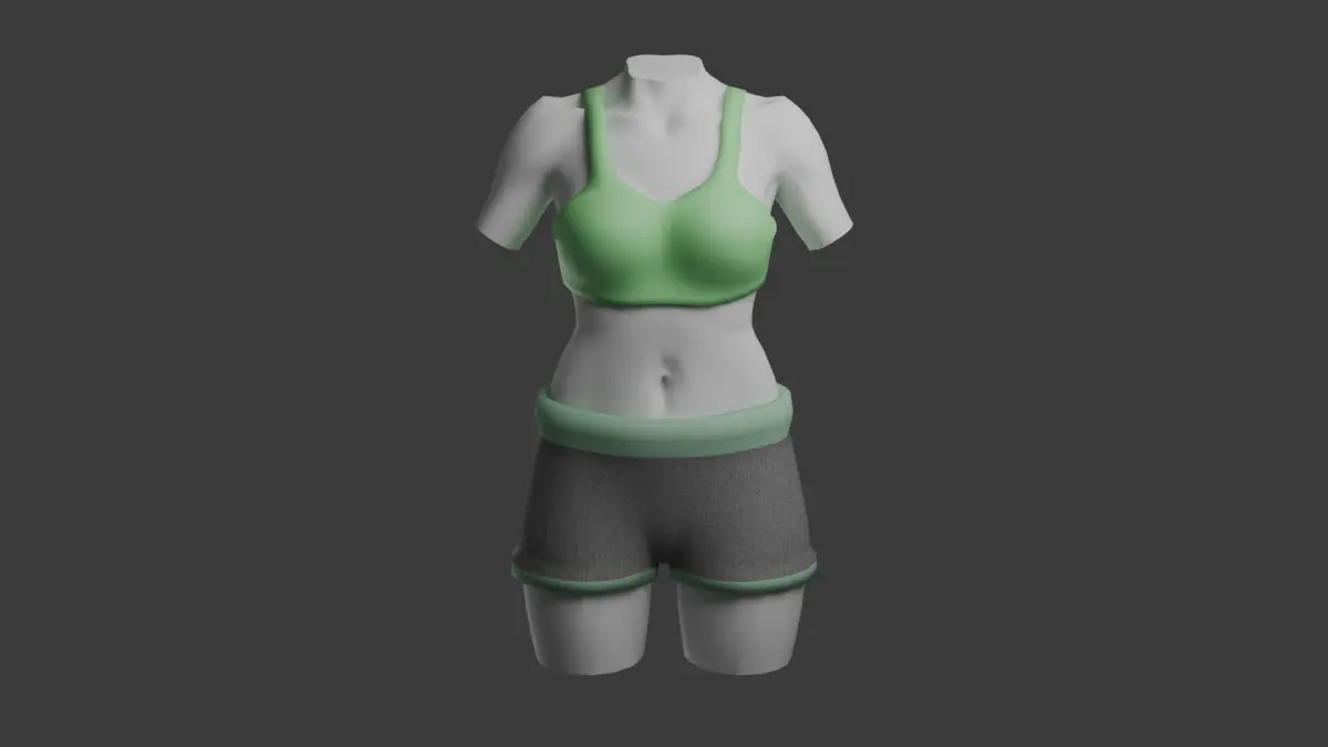 Female sports cloth pack.Contains two models: short and sport brassiere.Both models contain in total 4,400 plygons (brassiere - 2,016; short - 2,384).You can switch cloth color and material properties as you like in native Brender file.Baked textures are in stl., obj., and fbx. format folders. Only color and roughness textures are used.