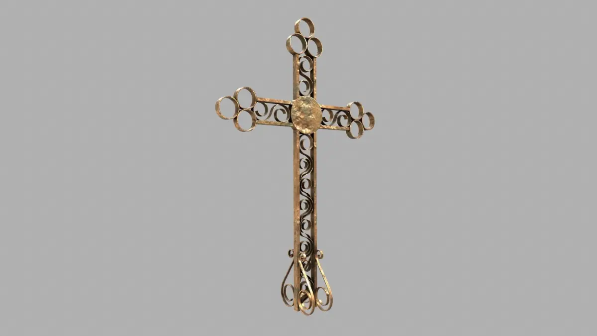 A small pack of an old grave with an ornate brass cross and grave fence typically seen in old eastern European graveyards.