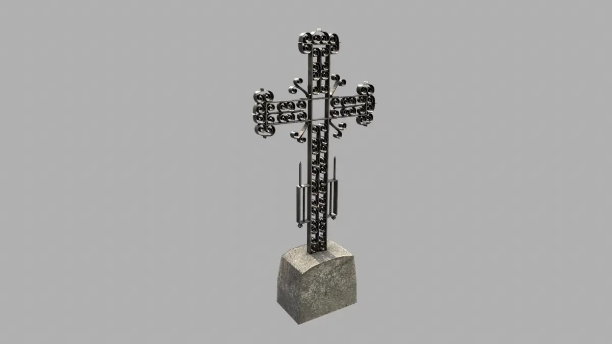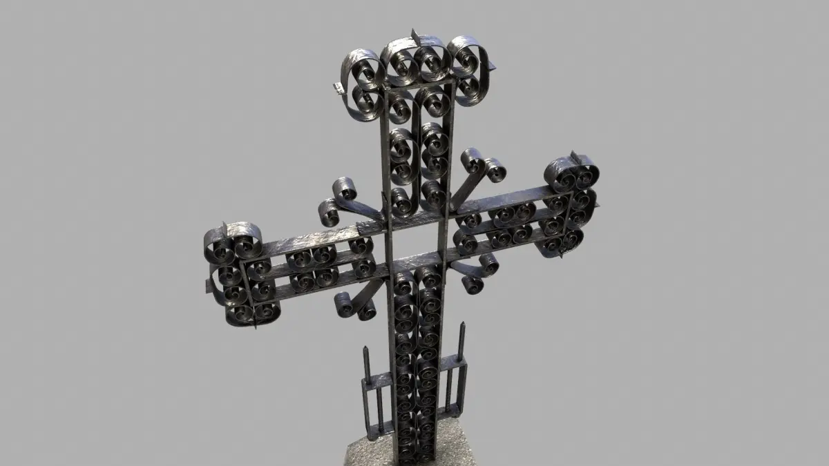 A small pack of an old grave with an ornate massive metal cross and old grave fence typically seen in old eastern European graveyards.