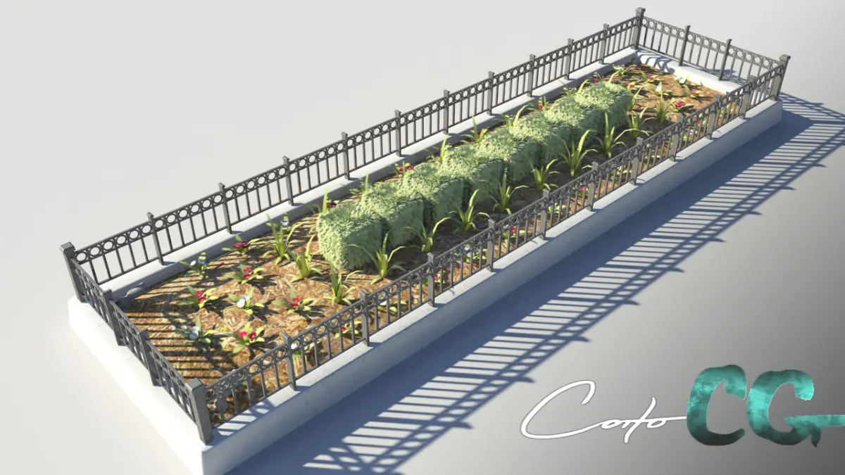 This planter has been modeled to resemble those found on city sidewalks and other urban settings. This planter is modeled to scale at 8.9 meters long, 2.5 meters wide and .93 meters tall. Model is fully UV'ed and textured with diffuse and specular maps, and care has been taken to balance performance with accuracy. Planter includes boxwood hedges, carex/banana-boat grasses, and white and red/violet petunias.