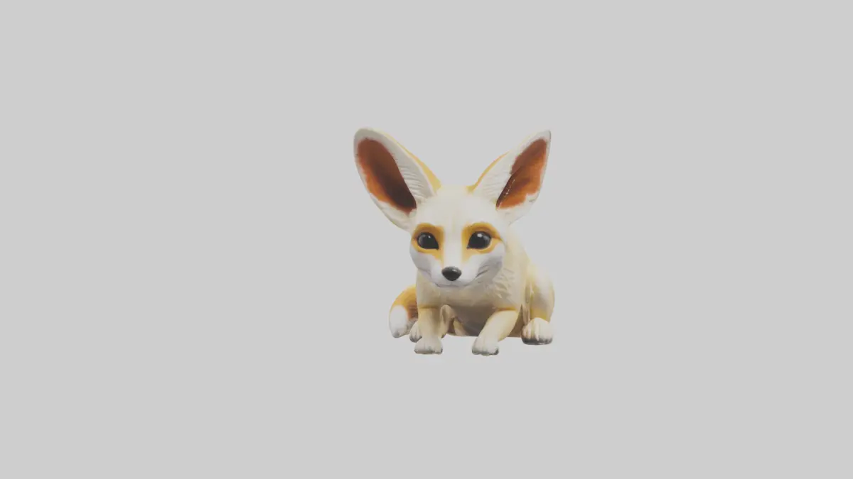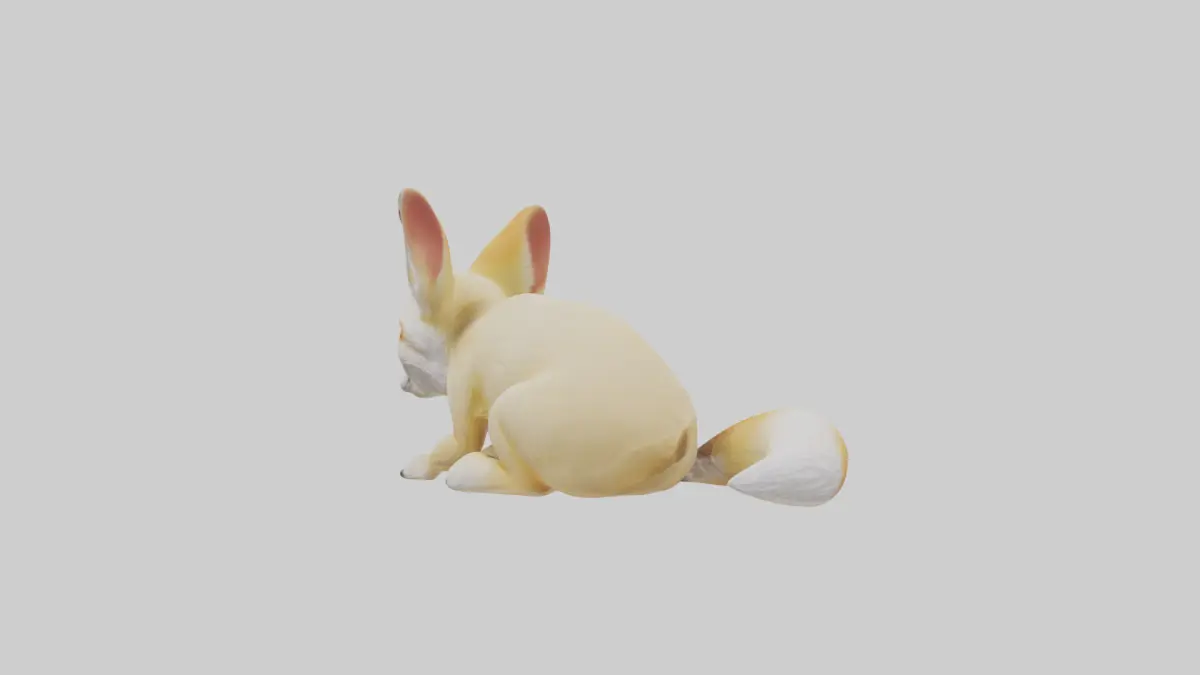 Concise 3D model of a Fennec Fox hiding. Depicts a Fennec Fox (Vulpes zerda), a small desert fox known for its large ears, in a pose suggesting it is hiding or concealed. This could involve the fox crouching low to the ground, partially obscured, or peeking out from behind cover. Features its distinctive large ears, cream-colored fur, small body, and bushy tail. The model may also include elements of its desert habitat, such as sand or rocks. Suitable for wildlife documentaries, educational materials about desert animals, zoological exhibits, and nature visualizations. Available in FBX, OBJ, STL, GLB, USDZ, and BLEND formats.