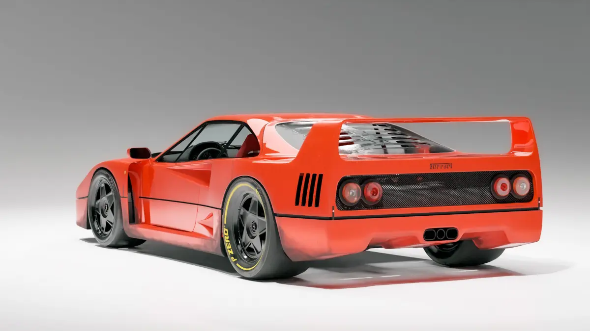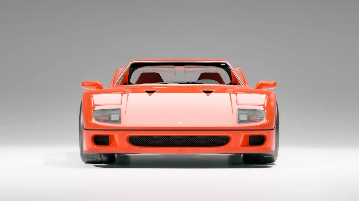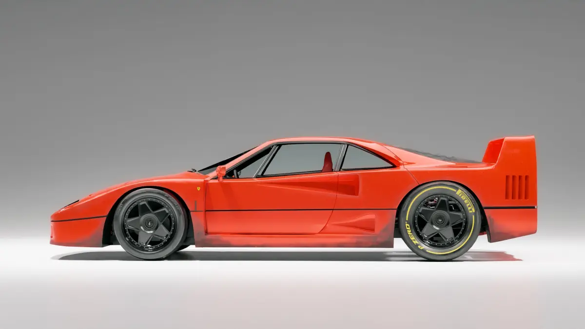 Ferrari F40 with custom Rotiform wheels on Pirelli Racing tires.High quality textures with optional damage (ground dirt as well as scratches and water drop marks) all optimized for Blenderdetailed engine and interior Realistic red fabric seats with custom racing seatbeltsHigh quality dashboard and gear cluster replicating the real car