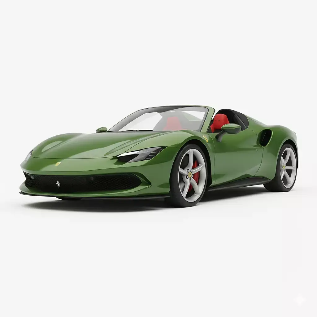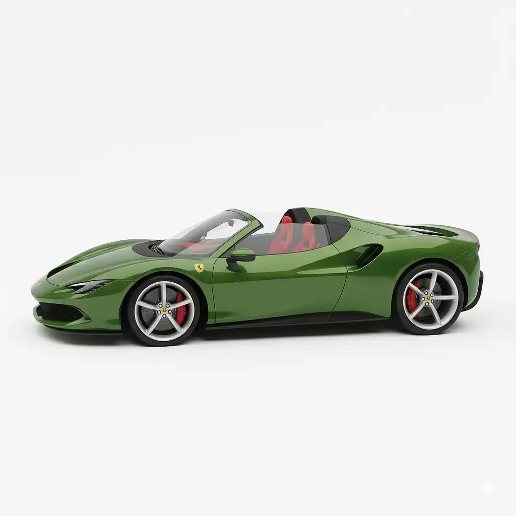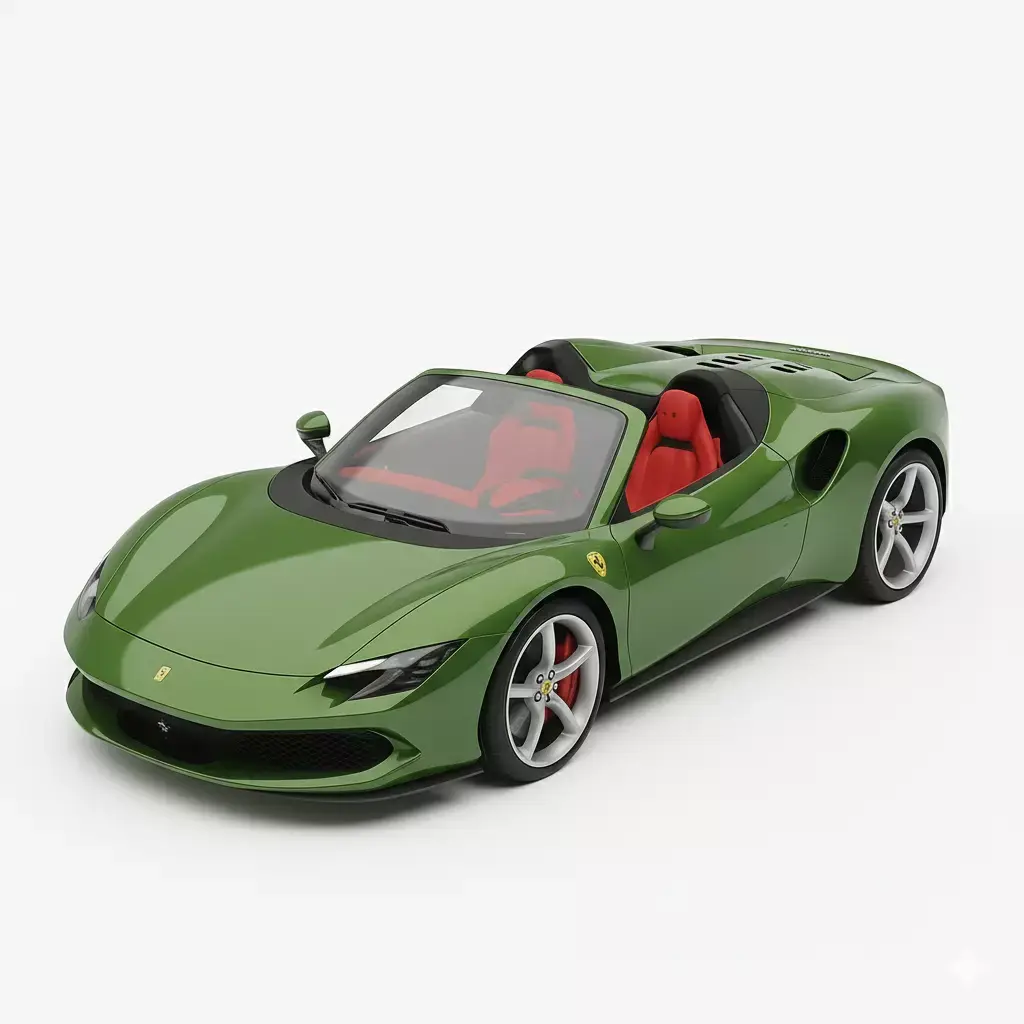 This is a photorealistic 3D model render of the 2025 Ferrari 12Cilindri Spider Concept, Ferrari's latest V12-powered, front-mid-engined grand tourer. The model is finished in a sophisticated, deep metallic green color, which is a nod to a custom or heritage shade like Verde Toscana, a color specifically featured on the press cars. The vehicle is depicted as a convertible (Spider) with the retractable hardtop down, showcasing the futuristic dual-cockpit interior rendered in a vibrant red leather upholstery. The design emphasizes aerodynamic efficiency with its long hood, clean flanks, and distinct flying buttresses over the rear deck. This high-quality asset accurately captures the 12Cilindri's sleek, modern styling and would be perfect for high-end automotive visualization, marketing, or use in premium racing and simulation games.