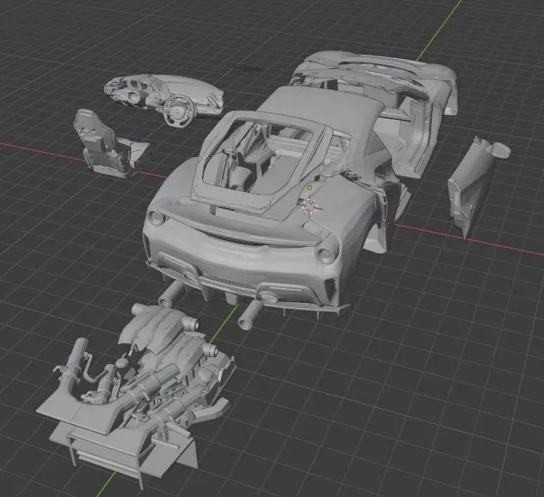 The model includes:Body, front and rear wheels, doors, lights, seats, mirrors, engine, etc.