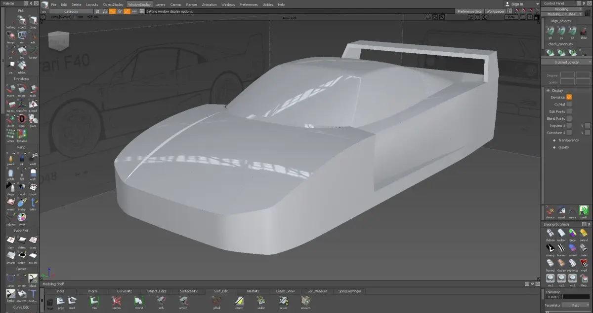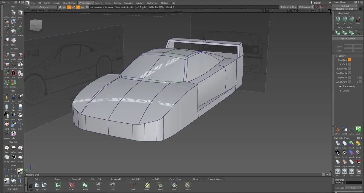 In this 3d model you can find the Ferrari F40, closed in teorical, without fillet, for continue my series of tutorial on Autodesk Alias.