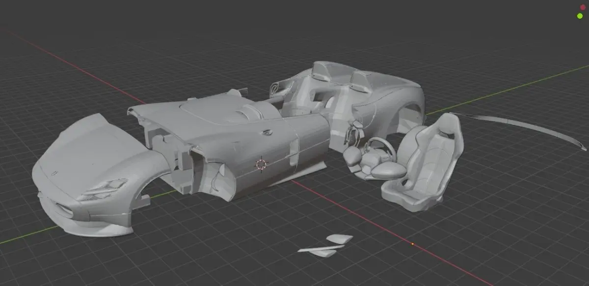 The model includes:Body, front and rear wheels, doors, lights, seats, mirrors, engine, etc.
