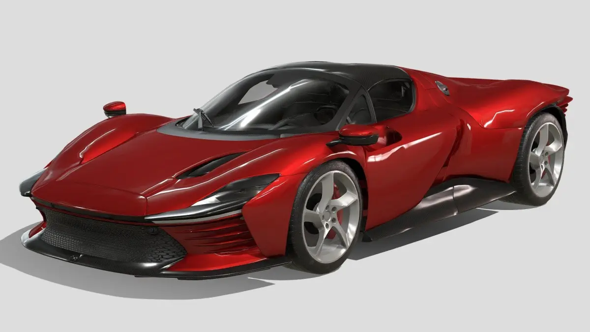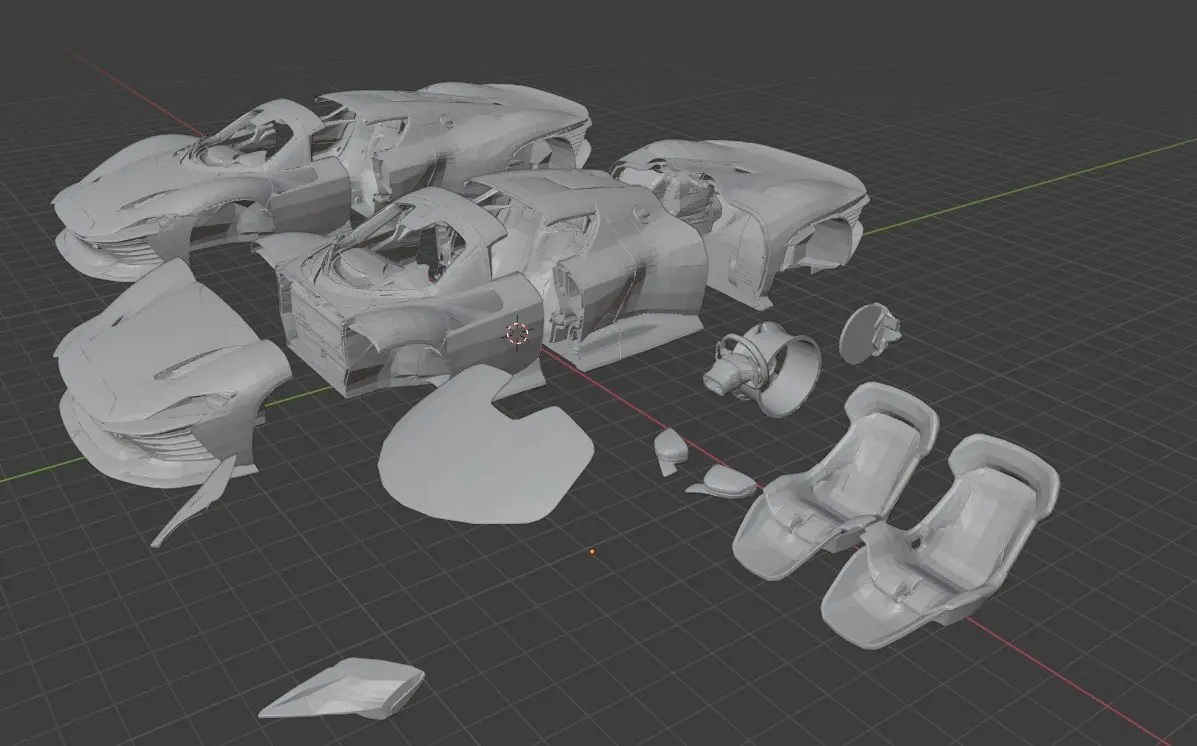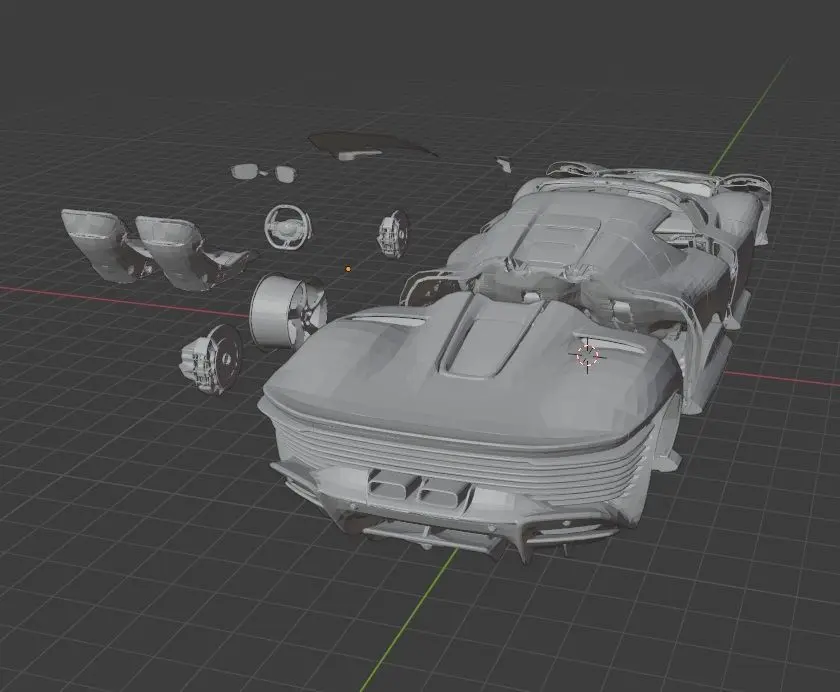 The model includes:Body, front and rear wheels, doors, lights, seats, mirrors, engine, etc.